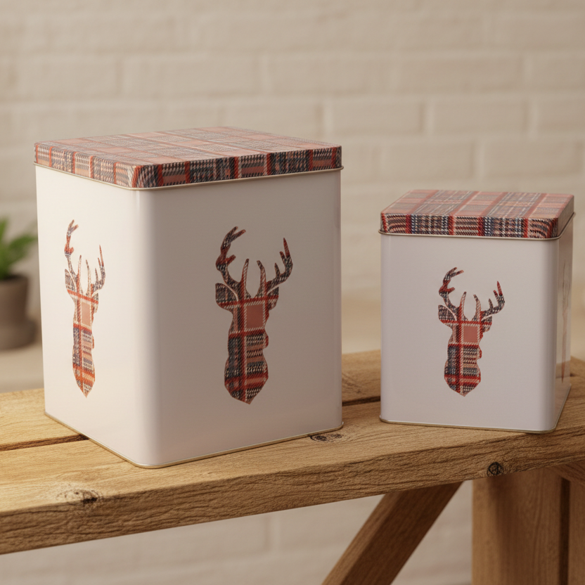 Praktiske og dekorative metallbokser i beige med rutet hjortemotiv i rødt. Settet består av to bokser i ulike størrelser, begge med lokk i matchende rutemønster. Perfekte til oppbevaring av småting, julekaker, kaffe, te eller annet du vil ha lett tilgjengelig.