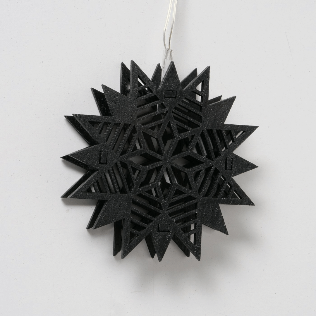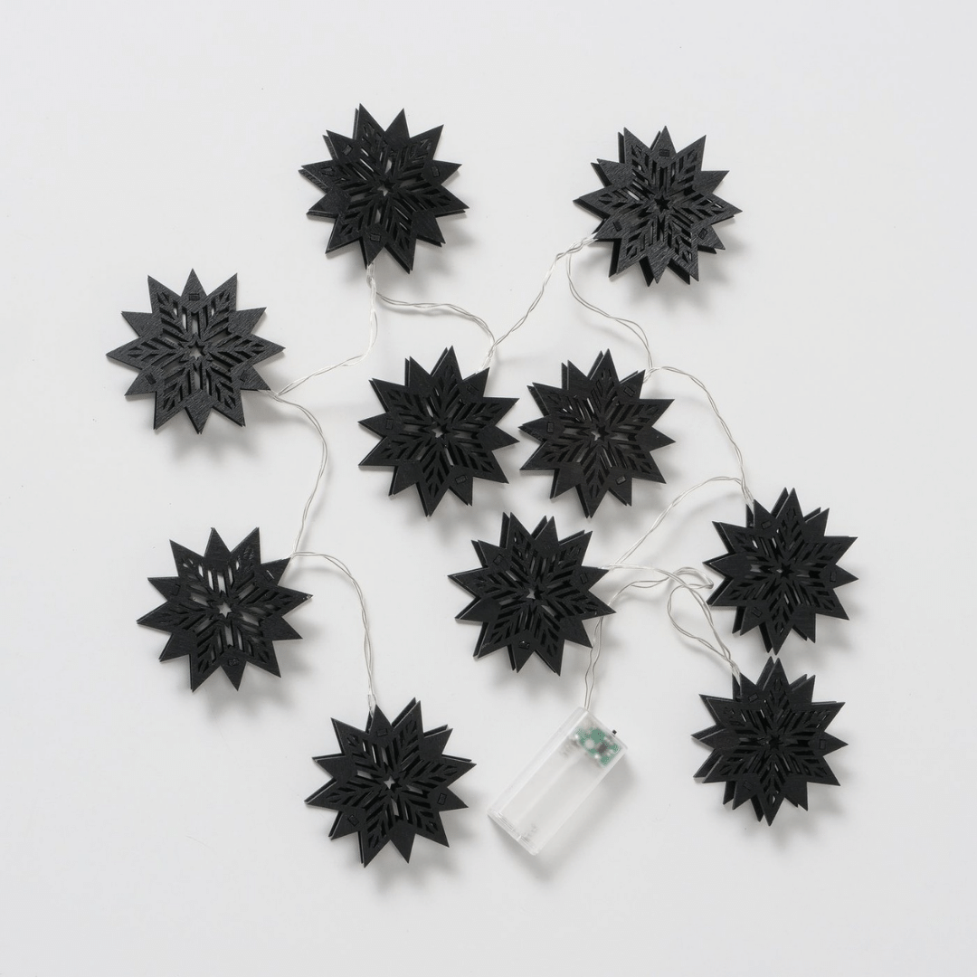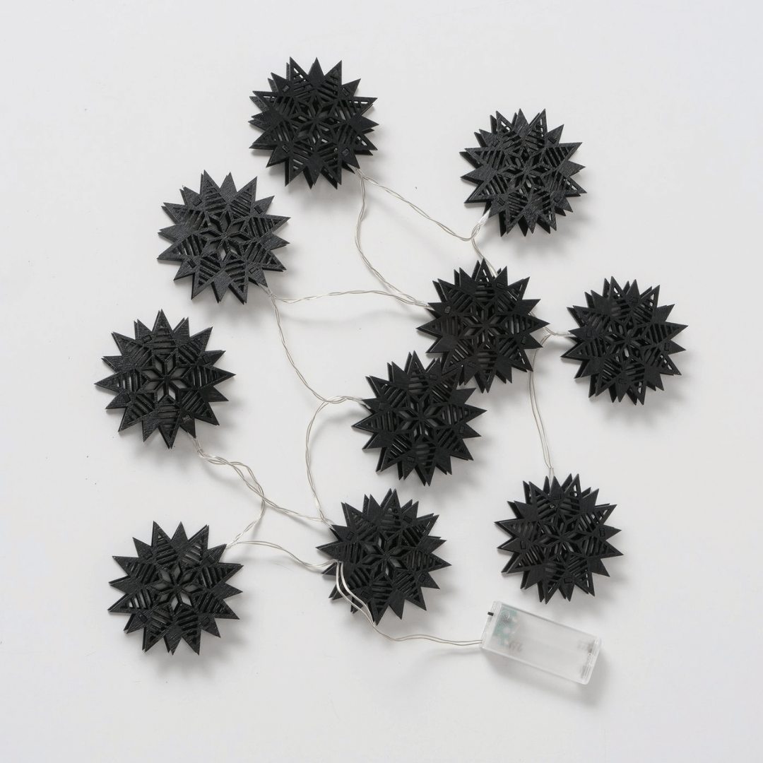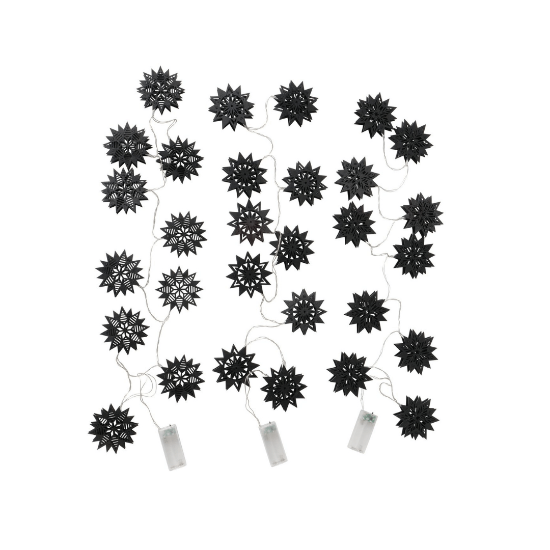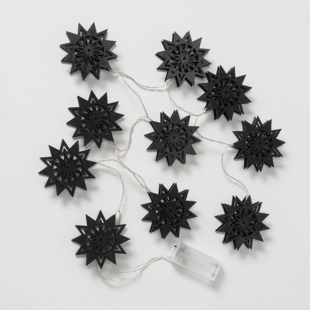 LED-lyslenke med sorte stjerner i tre henger i et vindu, lyser varmt og skaper julestemning med snødekt landskap utenfor og granbar på vinduskarmen.