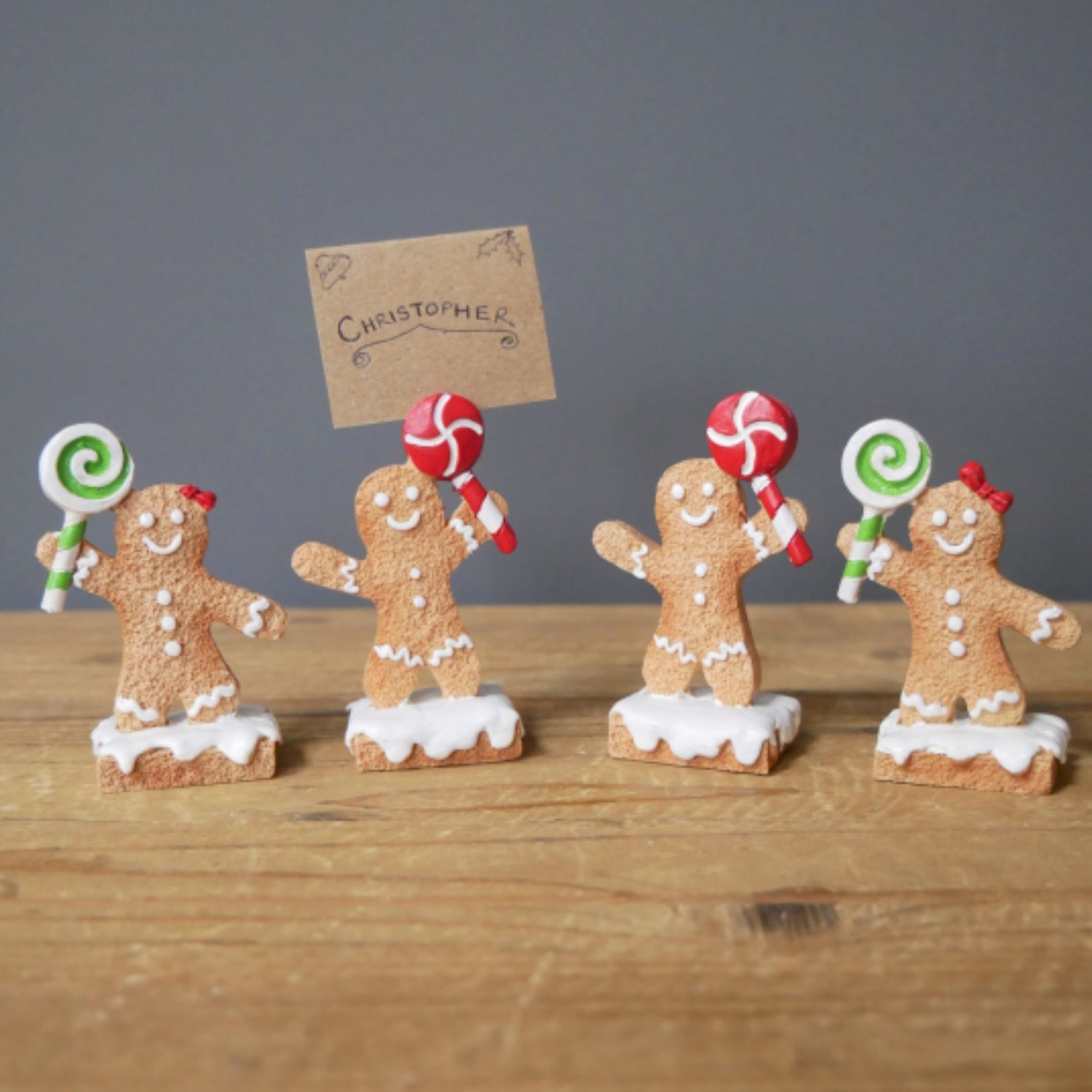 Disse sjarmerende kortholderne i form av pepperkakemenn er den perfekte dekorasjonen for julebordet. Med fire figurer som holder søte lollipops, gir de et lekent preg på enhver festlig setting.