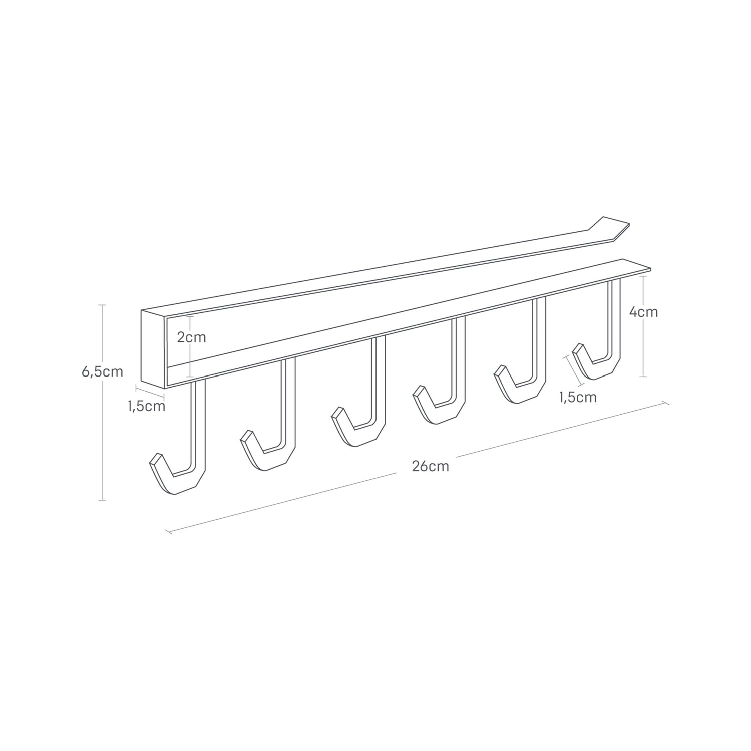 Krokrekken festes under en hylle eller et skap og gir deg seks kroker til oppheng av kjøkkenredskaper. Den plassbesparende løsningen gjør det enkelt å utnytte området under hyllen bedre, samtidig som kjøkkenet føles mer ryddig og oversiktlig. Ekstra oppbevaring under hyllen gir mer orden og frigjør plass på kjøkkenbenken.
