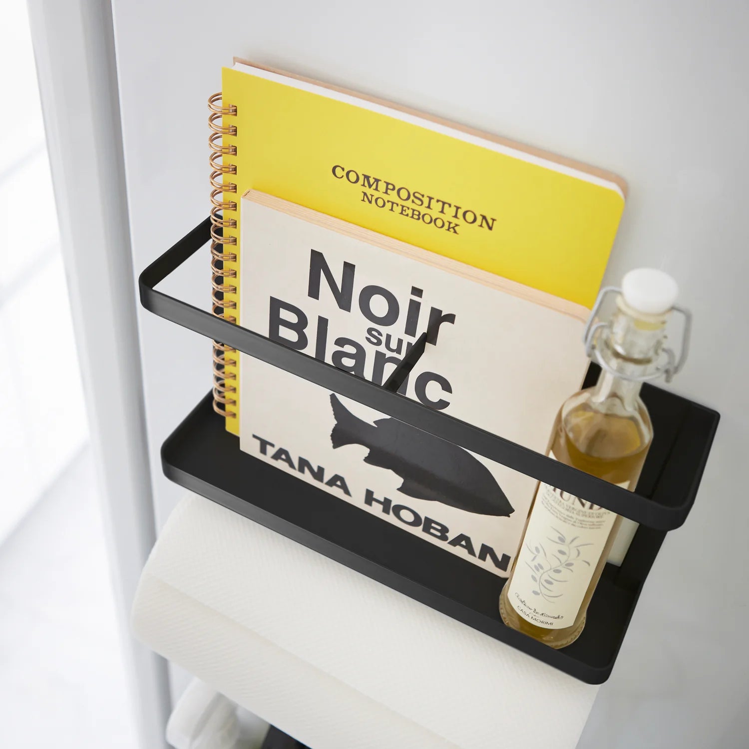 Få bedre orden på kjøkkenet med en praktisk oppbevaringshylle som utnytter siden av kjøleskapet eller andre metallflater. Denne sorte modellen gjør det enkelt å samle kjøkkenpapir, folie, kjøkkenredskaper og småting på ett sted, slik at benken blir ryddigere og det du bruker ofte er lett tilgjengelig.