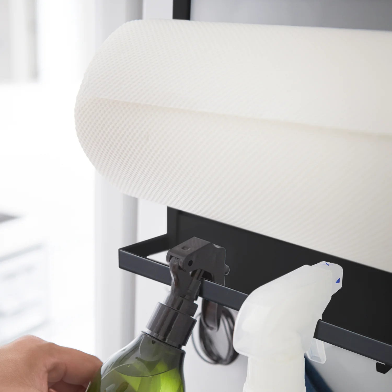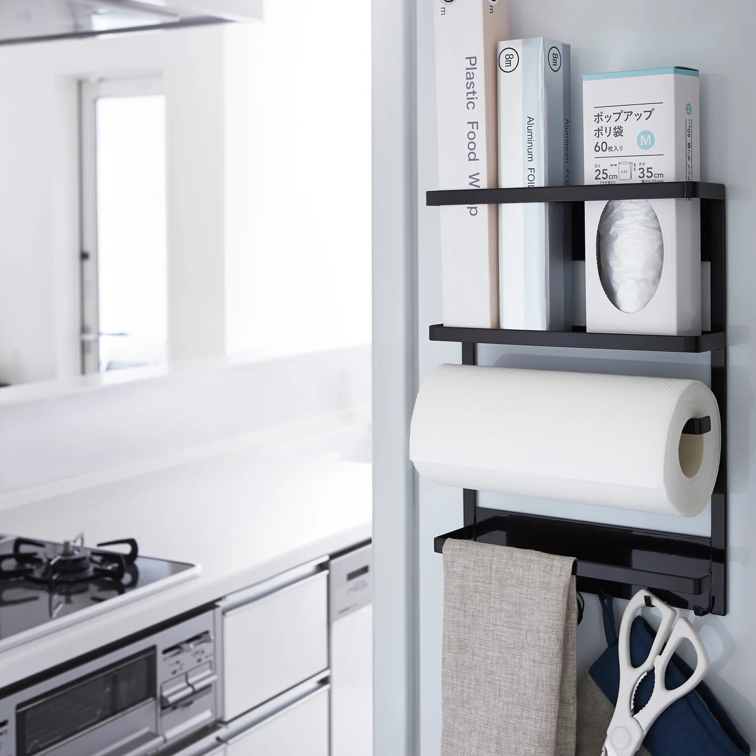 Med magnetisk feste uten boring, egen oppbevaring kjøkkenpapir og krokrekke til redskaper, får du en smart løsning som hjelper deg å bruke plassen bedre i hverdagen. Den øverste holderen gir plass til små kjøkkenartikler og ruller, mens de to stengene under passer godt til kjøkkenpapir og kluter. Nederst gir krokrekken ekstra opphengsplass til sleiver, skjeer og annet utstyr du vil ha nær arbeidsområdet.