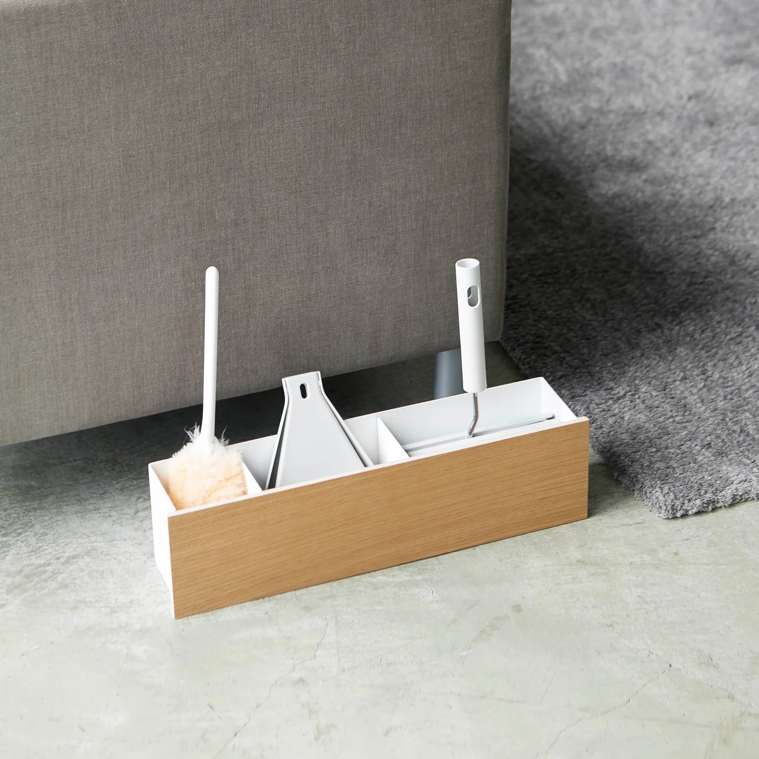Med bred oppbevaringsplass, 2 flyttbare skillevegger og kombinasjon av stål, tre og magnetiske detaljer, får du en fleksibel løsning som kan tilpasses etter behov. Organizerens rom gjør det enkelt å sortere fjernkontroller, nettbrett, mobil, sakser, penner og andre småting, slik at bord, benk eller hylle ser ryddigere ut og det du trenger er lett å finne.