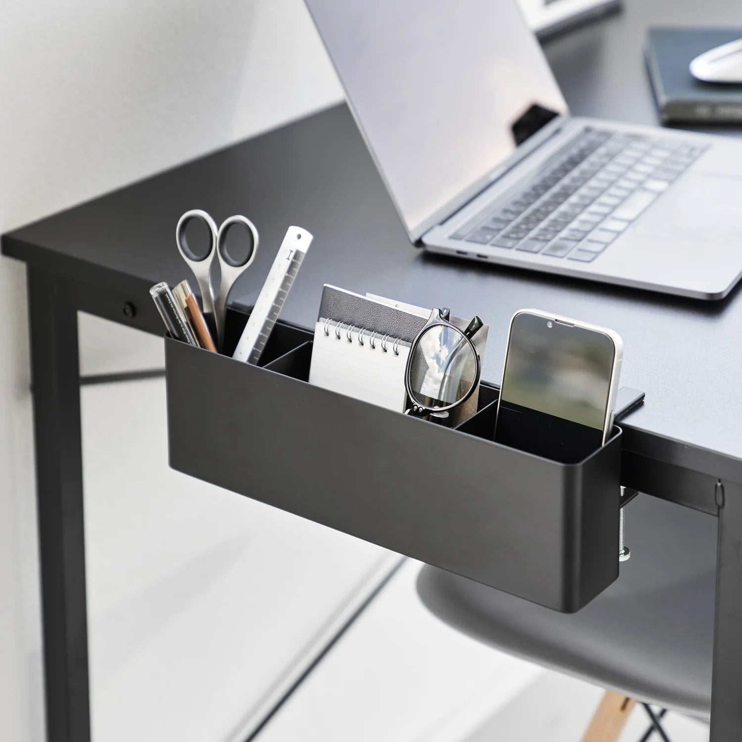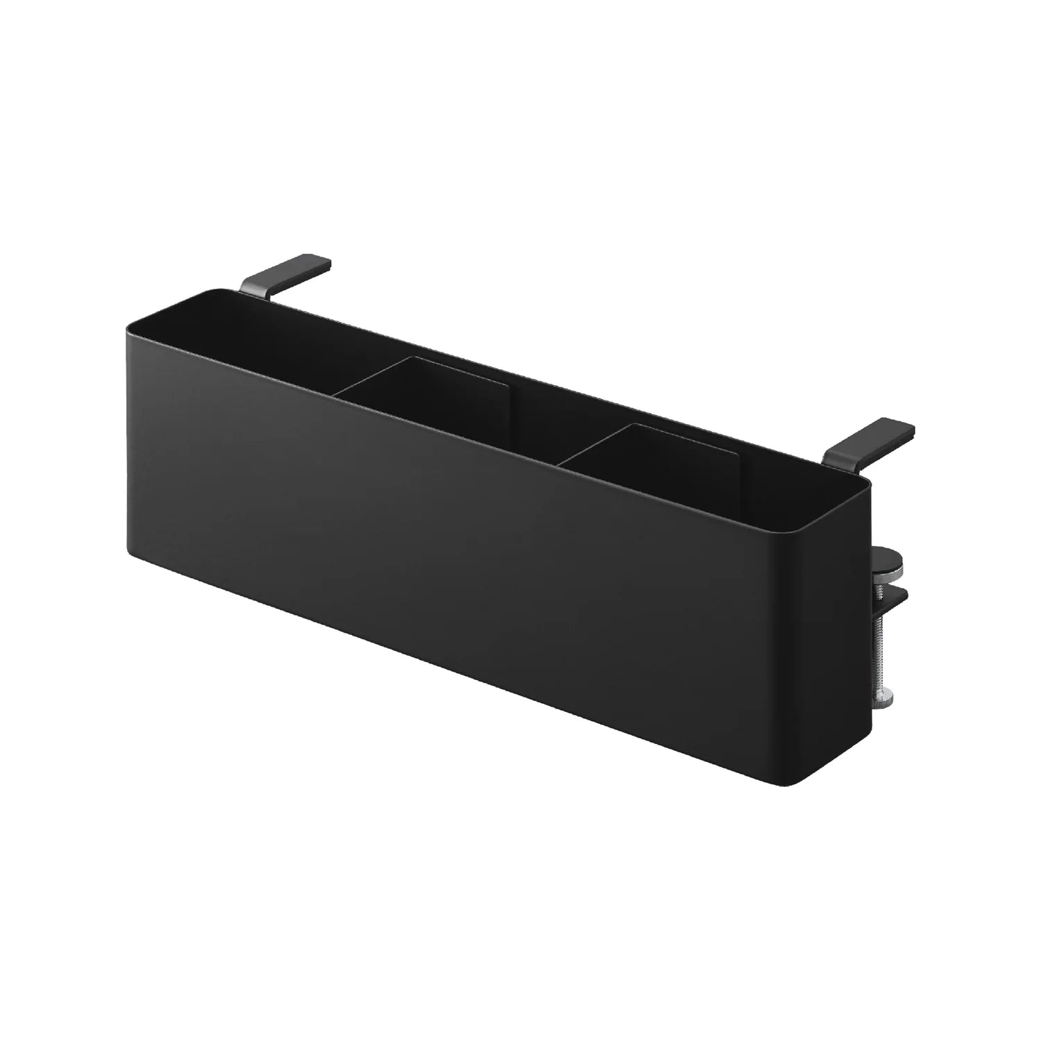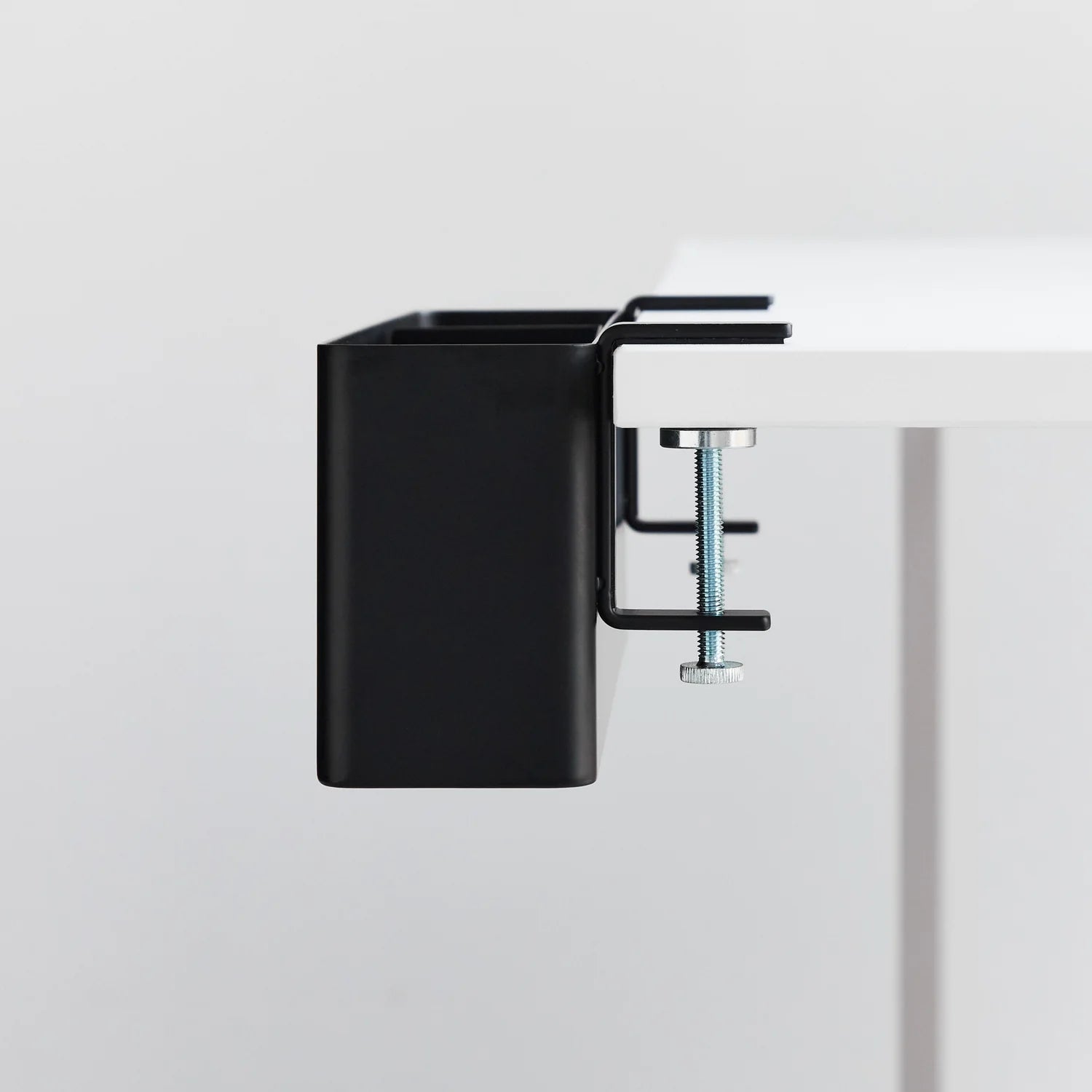 Dette er en solid oppbevaringsboks i metall som festes direkte på bordkanten. Du strammer bare festet med den medfølgende unbrakonøkkelen, og boksen henger stabilt på siden av bordet.