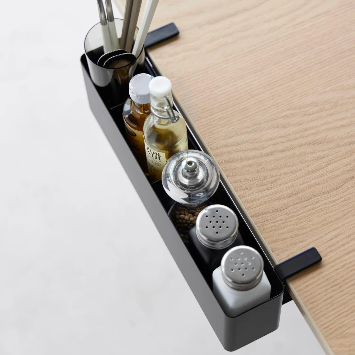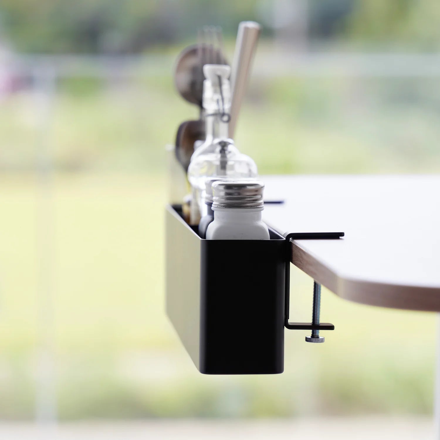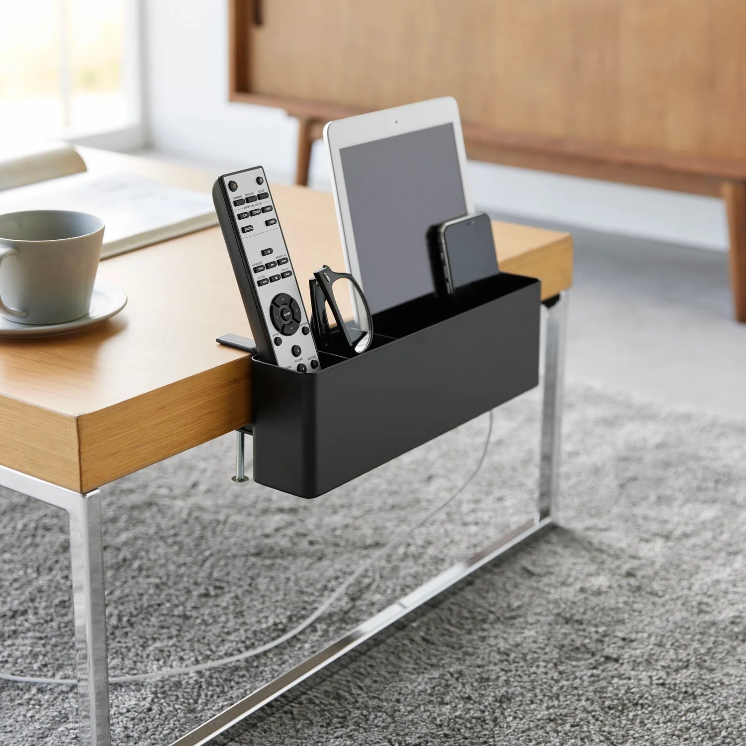 Dette er en solid oppbevaringsboks i metall som festes direkte på bordkanten. Du strammer bare festet med den medfølgende unbrakonøkkelen, og boksen henger stabilt på siden av bordet.