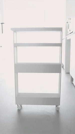 Denna funktionella förvaringsvagn ger dig enkel åtkomst till allt du behöver i badrummet, tvättstugan eller köket. Med fyra öppna hyllor och en smal design passar den perfekt i små utrymmen, till exempel mellan maskiner eller skåp.