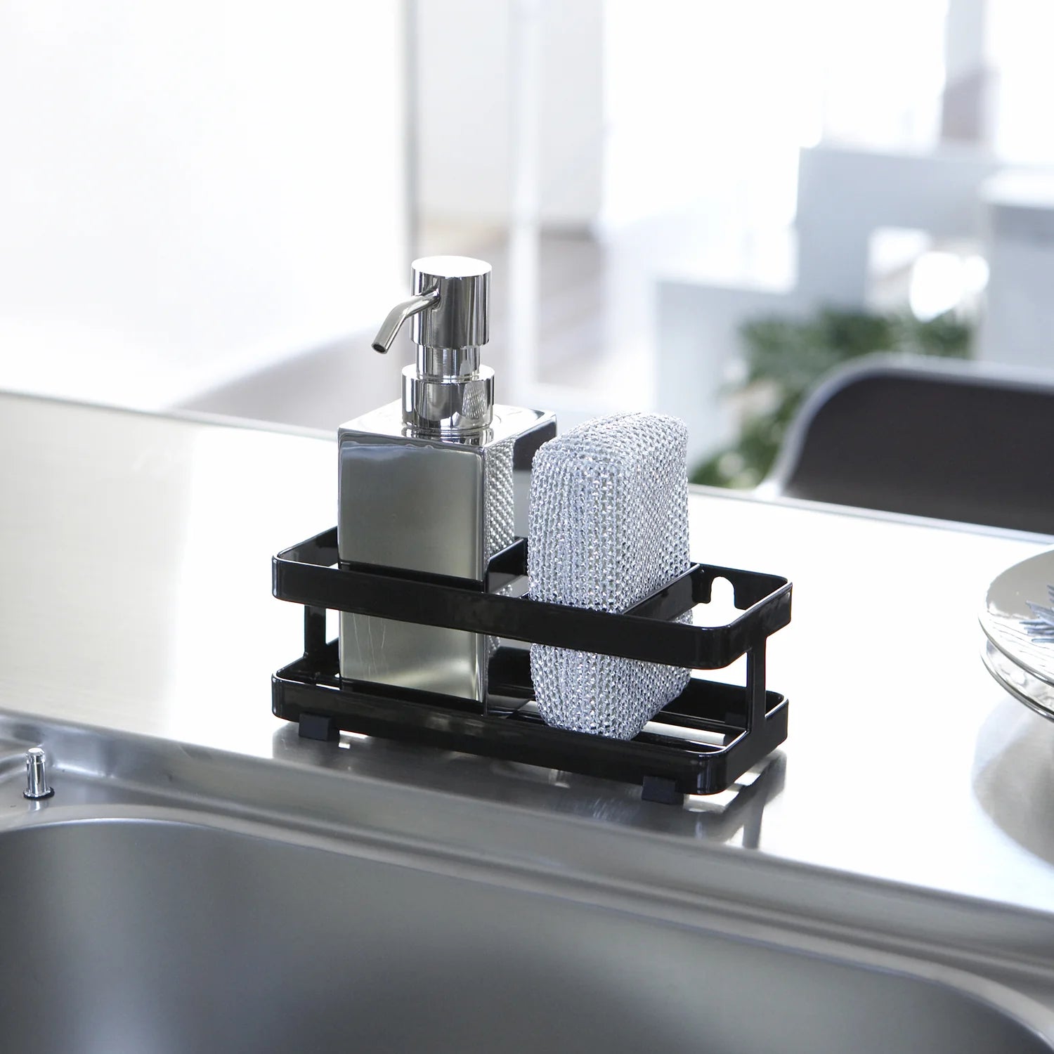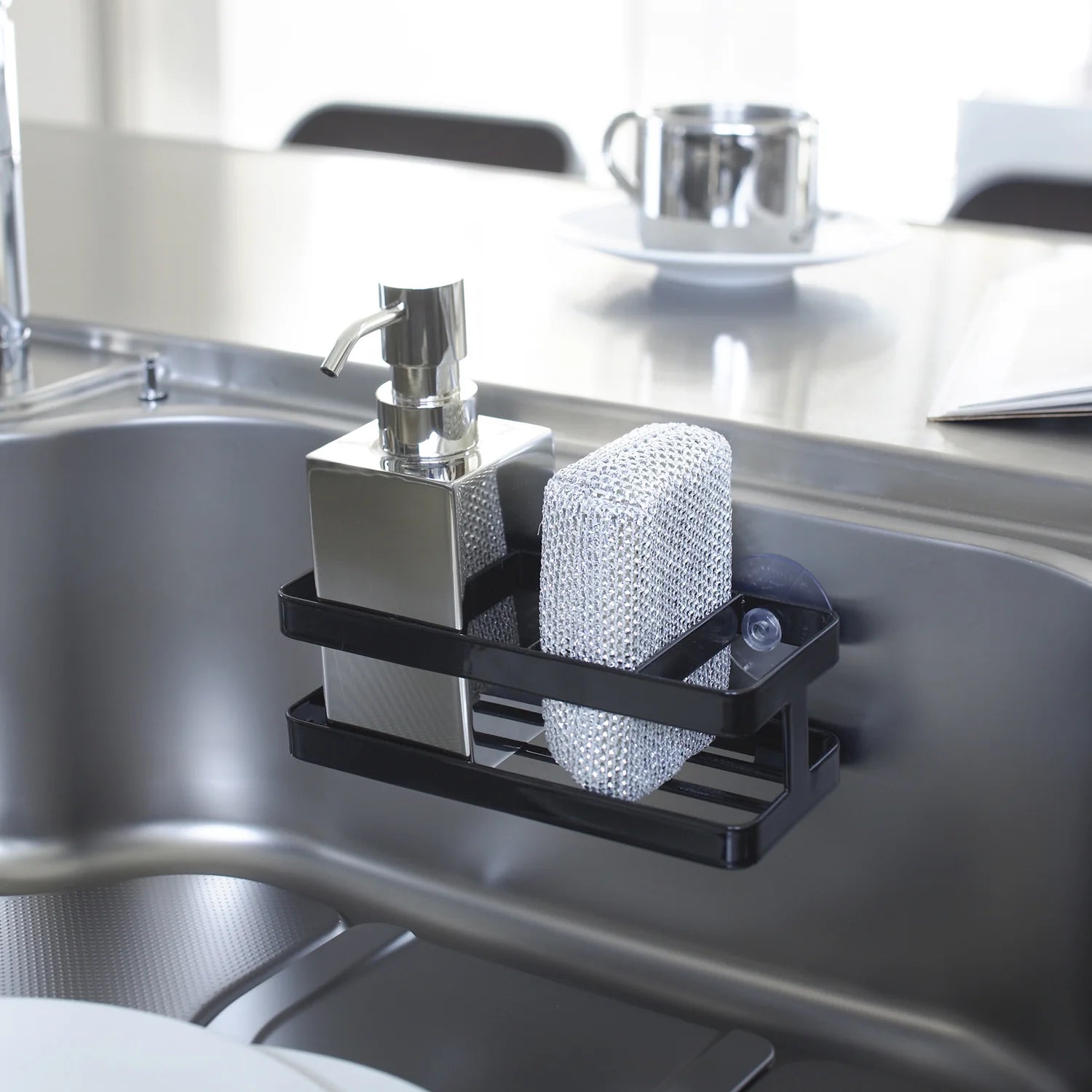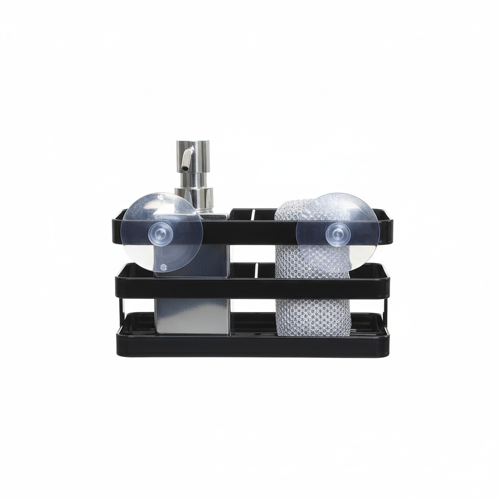 Hold kjøkkenvasken ryddig og det du bruker mest lett tilgjengelig med en praktisk holder som samler oppvaskmiddel, svamp og små kjøkkenartikler på ett sted. Den sorte utførelsen gir et mer gjennomført uttrykk ved vasken og gjør det enklere å holde benken fri for rot.