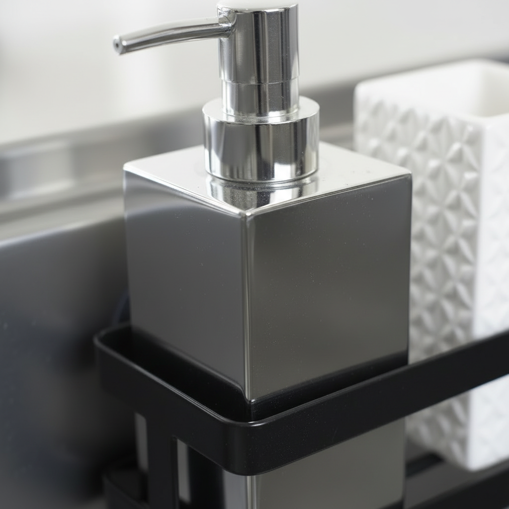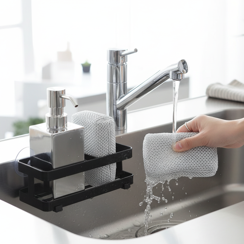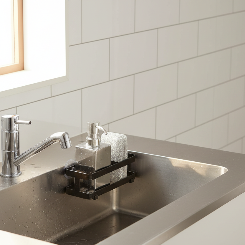 Denne holderen passer godt både inne i vasken og på fliser ved kjøkkenbenken. Den er fin til oppvasksvamp, oppvaskmiddel og børster, og fungerer spesielt godt i mindre kjøkken der du vil utnytte plassen bedre uten å fylle opp benkeflaten.