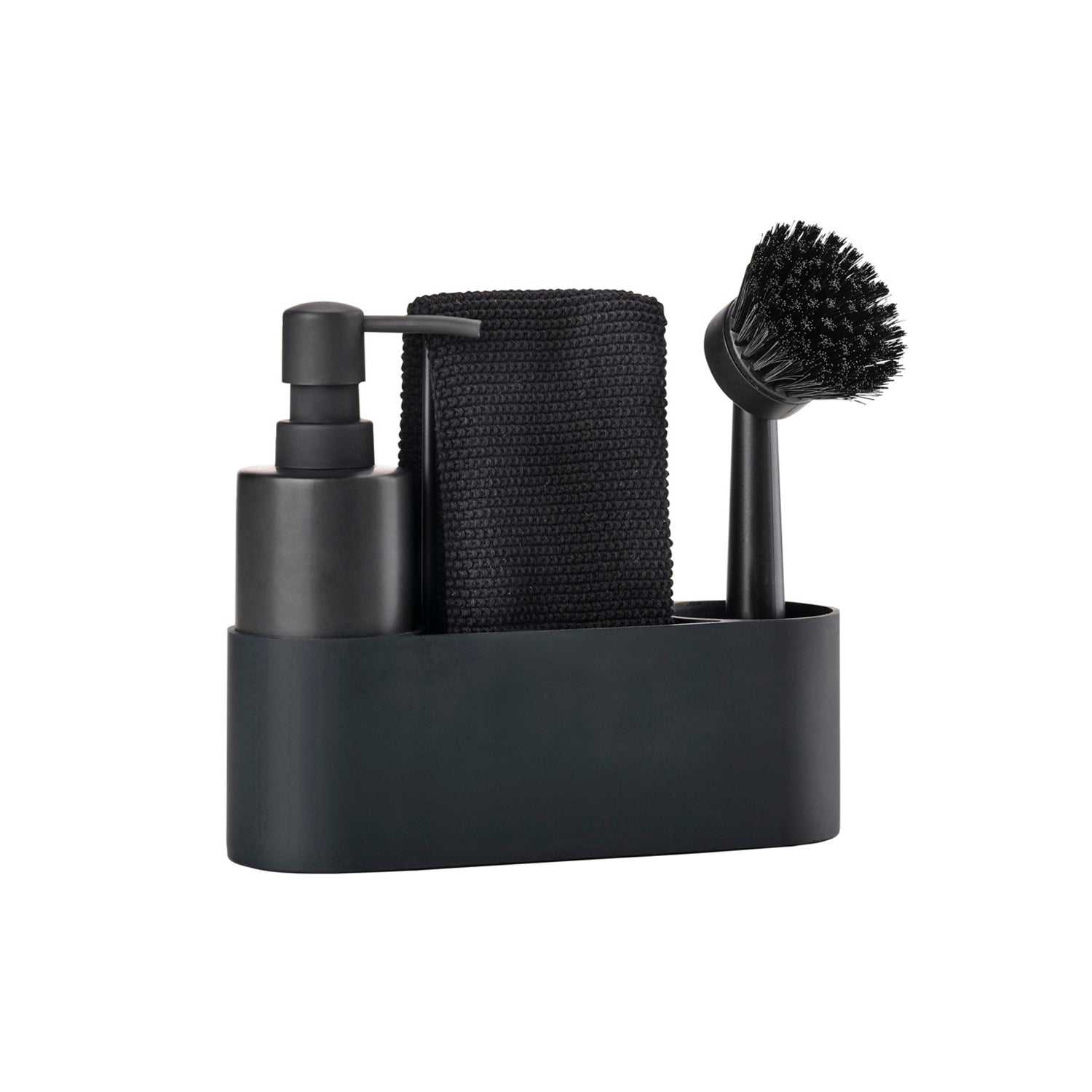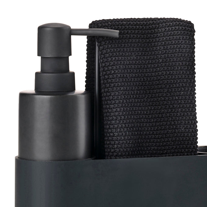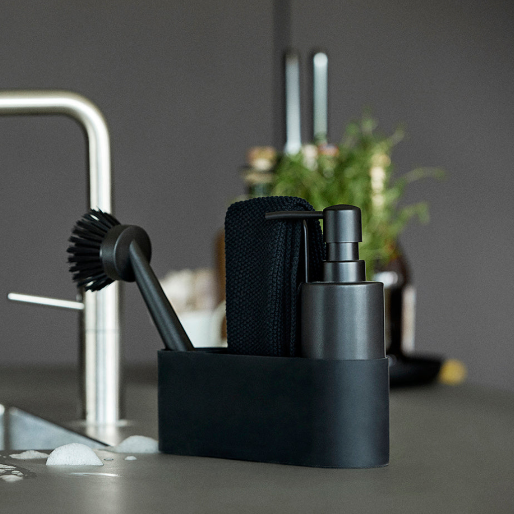 Settet består av keramisk såpedispenser, fleksibel silikonbeholder og utskiftbar oppvaskbørste samlet i en helhetlig form. Den sorte overflaten gir et ryddig uttrykk, mens metallbøylen fungerer både som håndtak og tørkestativ for kluten.