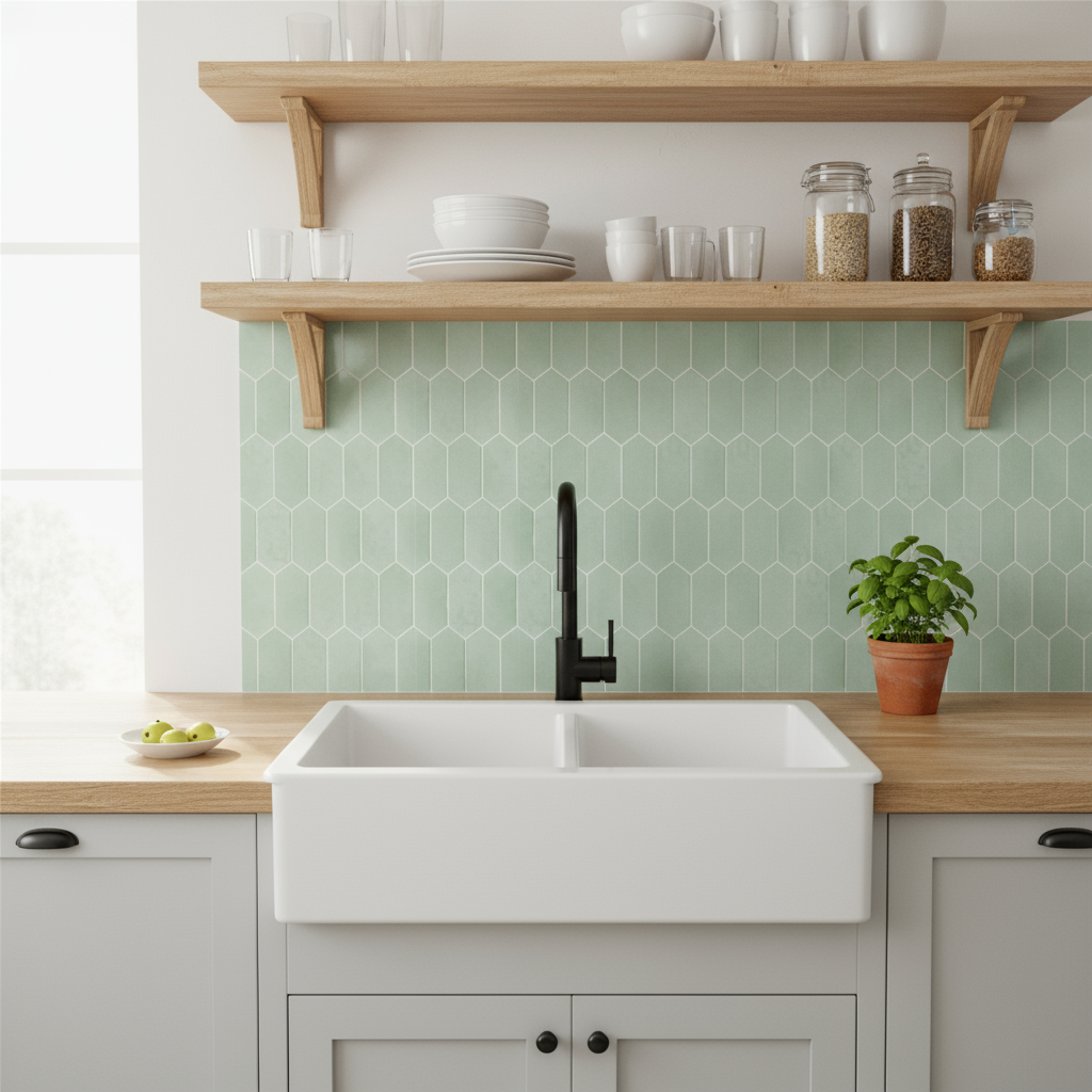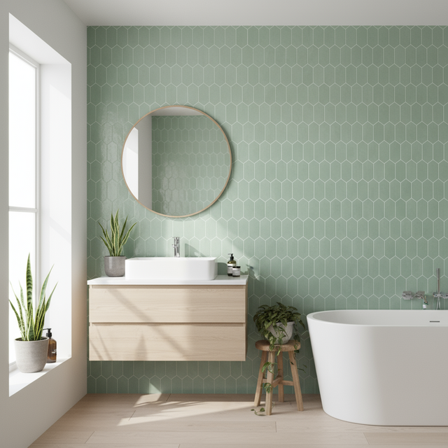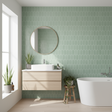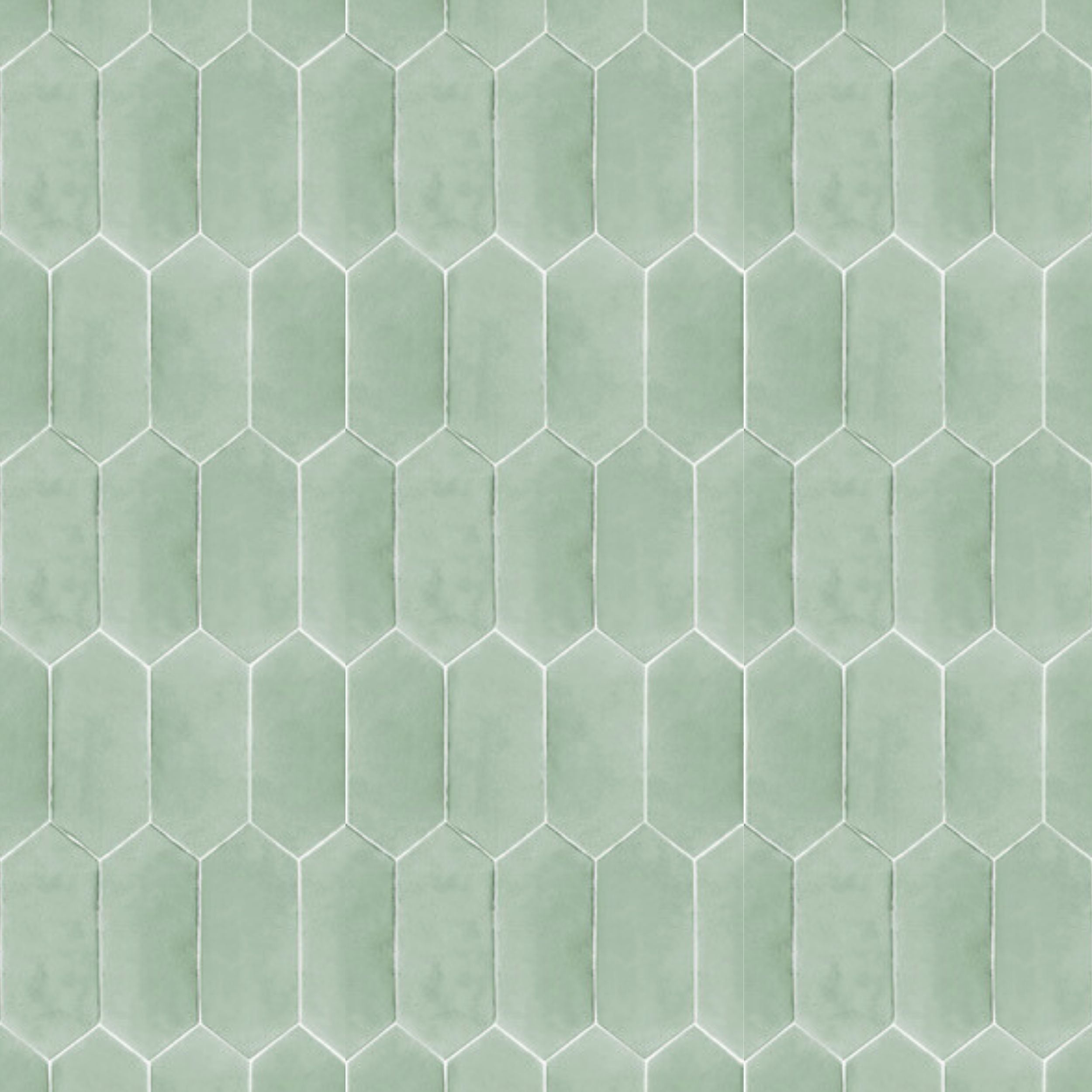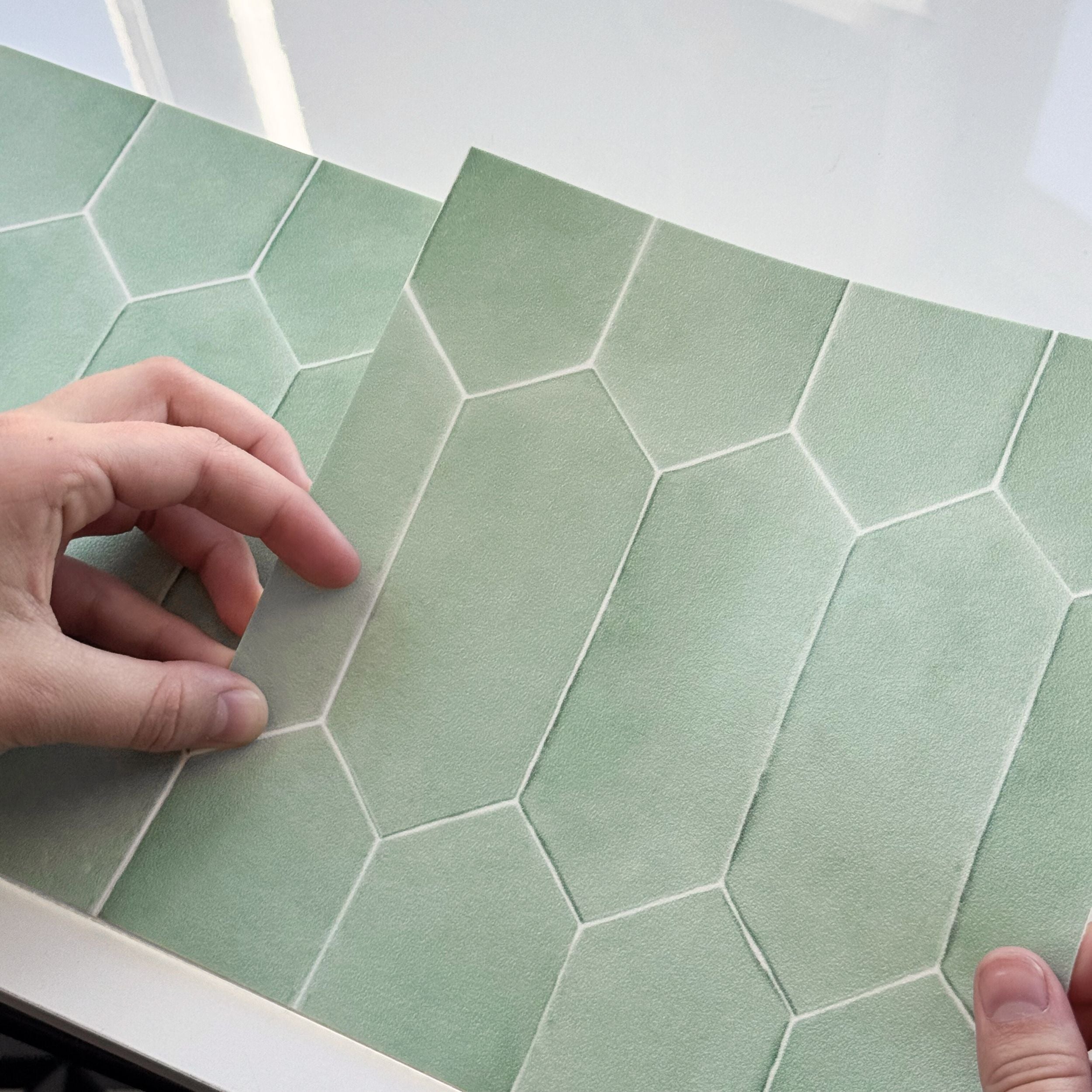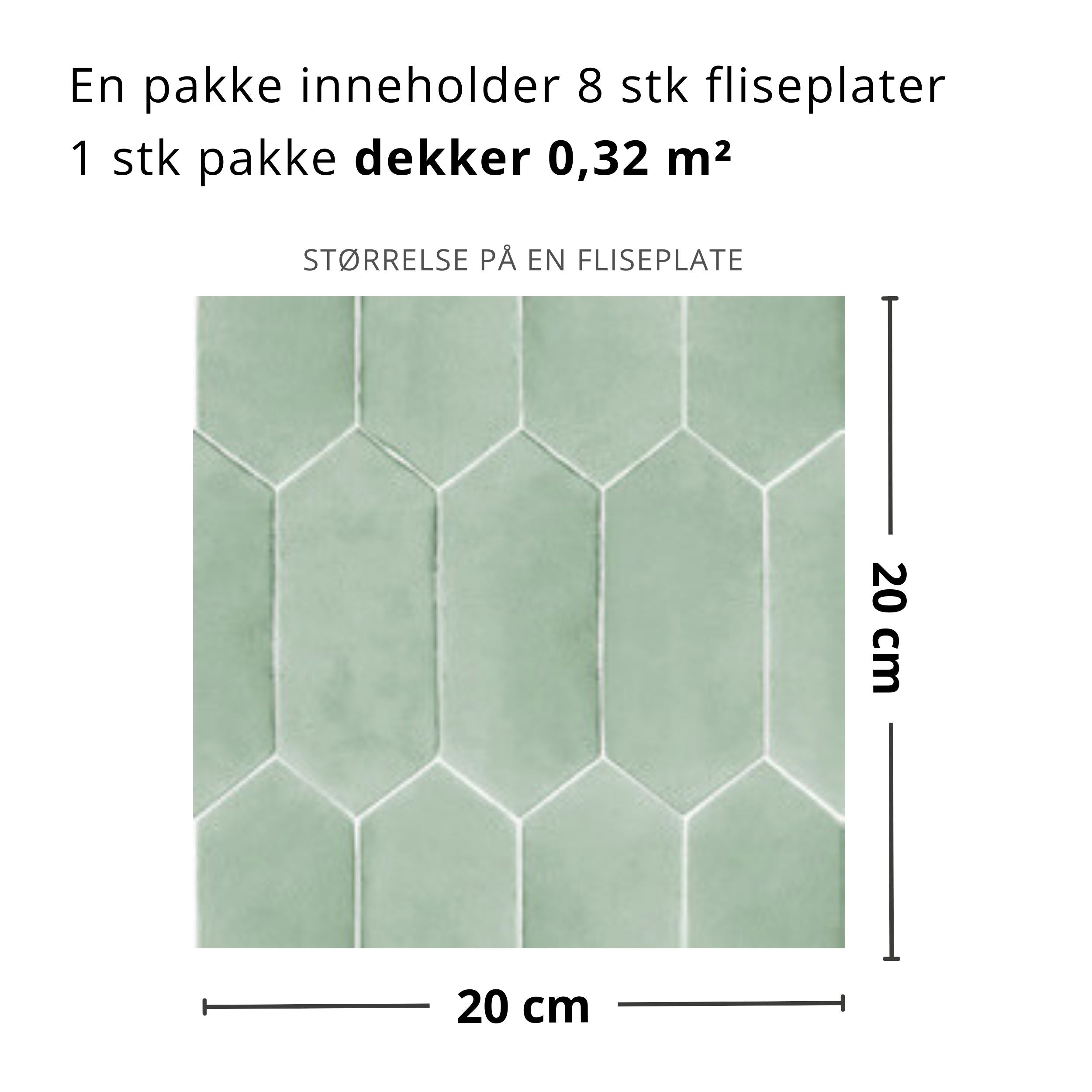 Oppgrader vegg eller gulv med den flotte selvklebende flisen i designet Mathilde. Denne fargen er en mellomlys grønnfarge med kald undertone og hvite fuger. Designet er laget for å etterligne zellige-fliser i lang, hexagonal motiv.