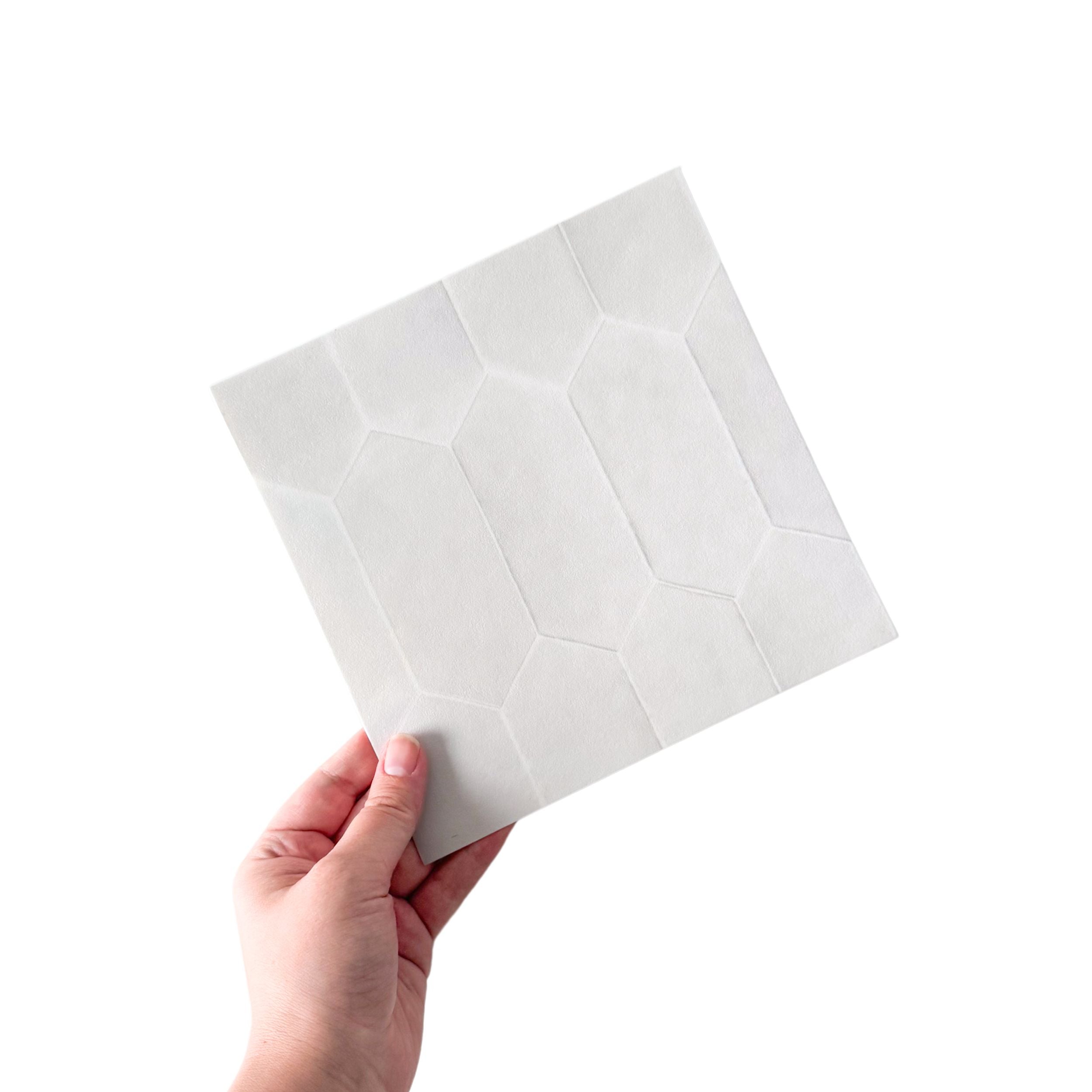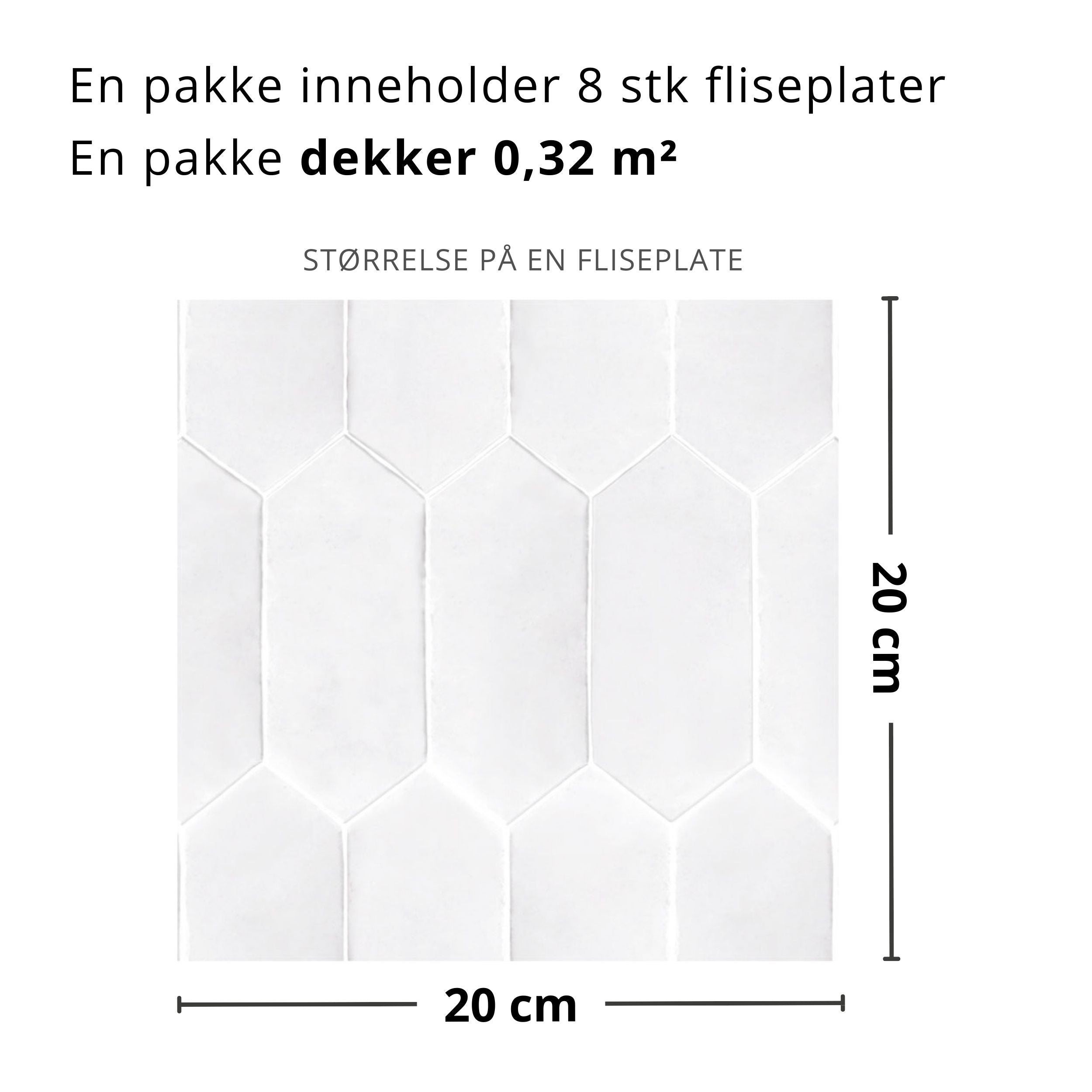 Oppgrader vegg eller gulv med den flotte selvklebende flisen i designet Mathilde. Denne fargen er en svært lys grå farge med kald undertone og hvite fuger. Ser utrolig fin ut sammen med andre kalde farger på kjøkken, bad og vaskerom. Designet er laget for å etterligne zellige-fliser i lang, hexagonal motiv.