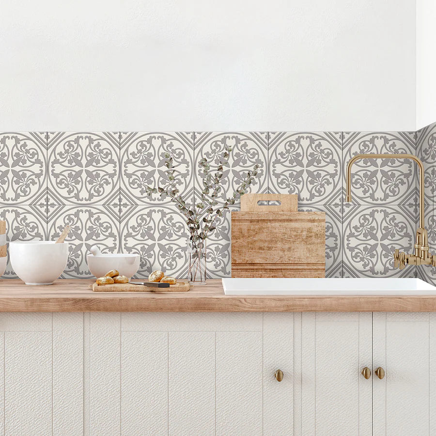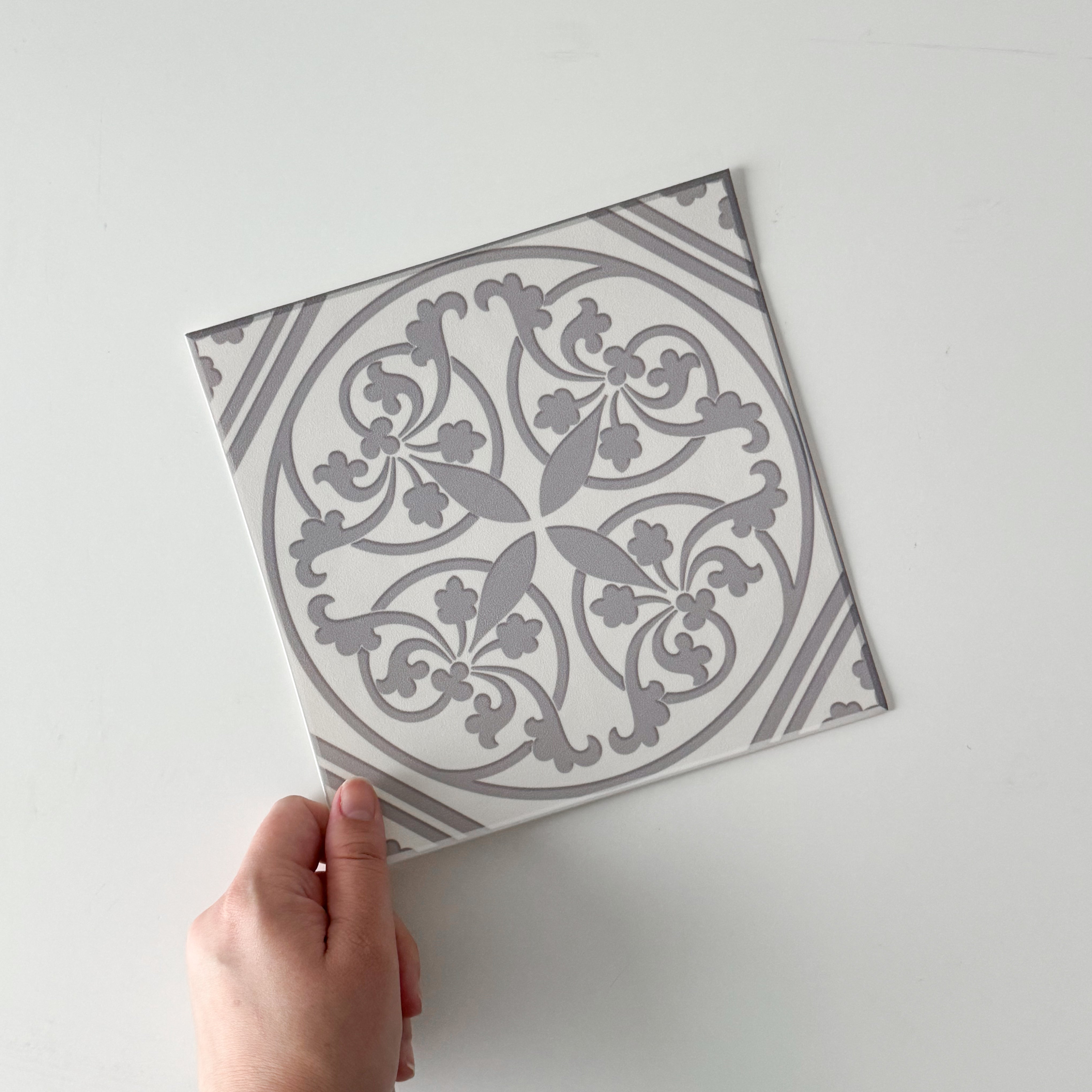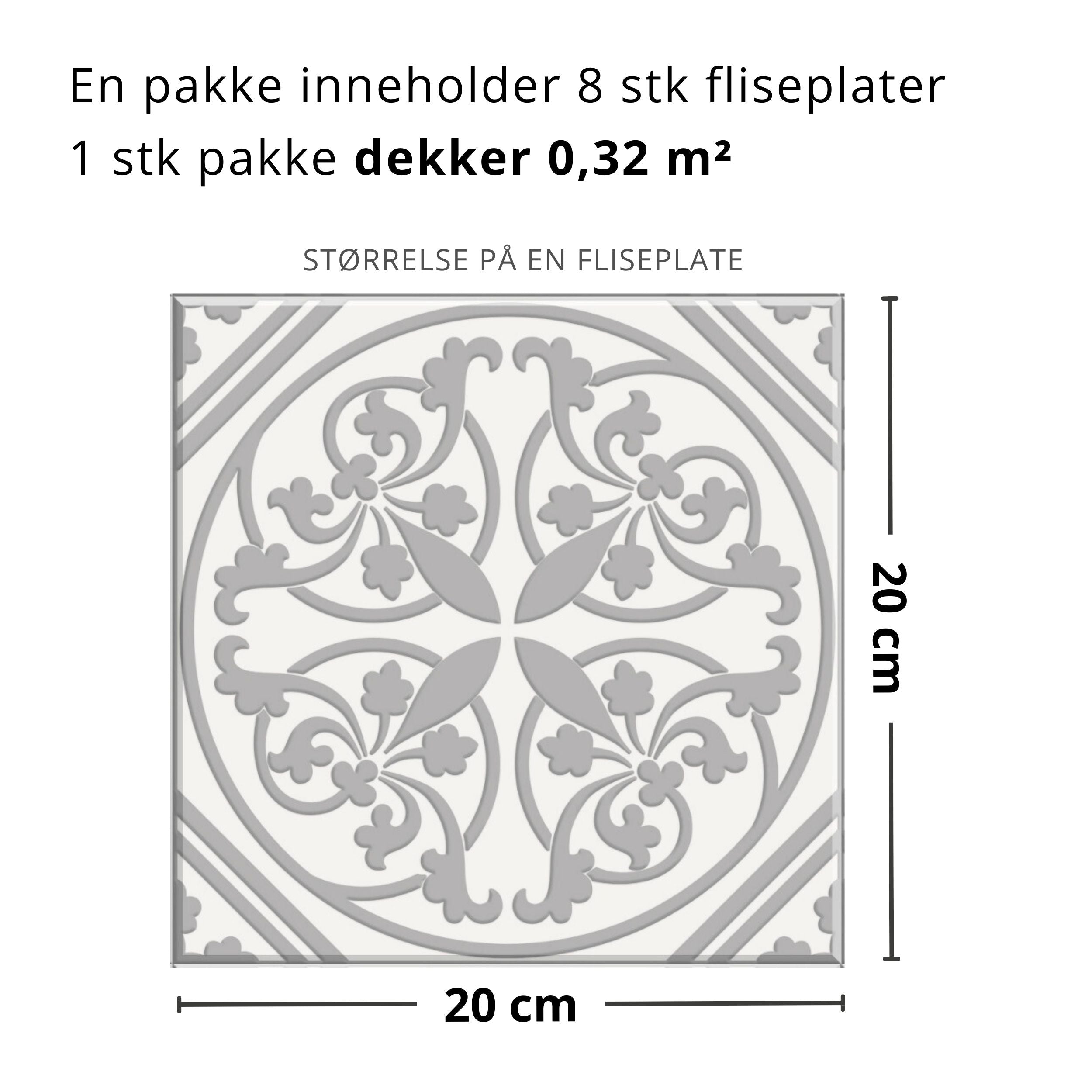Tavira antikk er en nydelig selvklebende flis inspirert av portugisiske fliser. Dens gråe motiv på en dempet bakgrunn av beige gir flisen en vintage følelse. Nydelig på både vegg og gulv.