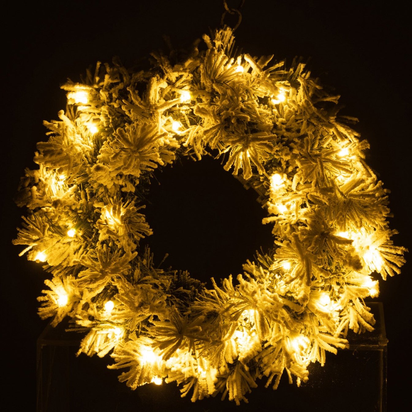 Kransen er utstyrt med varm, diskret LED-belysning som sprer et stemningsfullt lys og fremhever de snødekte grenene på en naturlig måte. Den krever lite vedlikehold, er enkel å plassere, og kan brukes både alene eller sammen med annen juledekorasjon for et helhetlig uttrykk.
