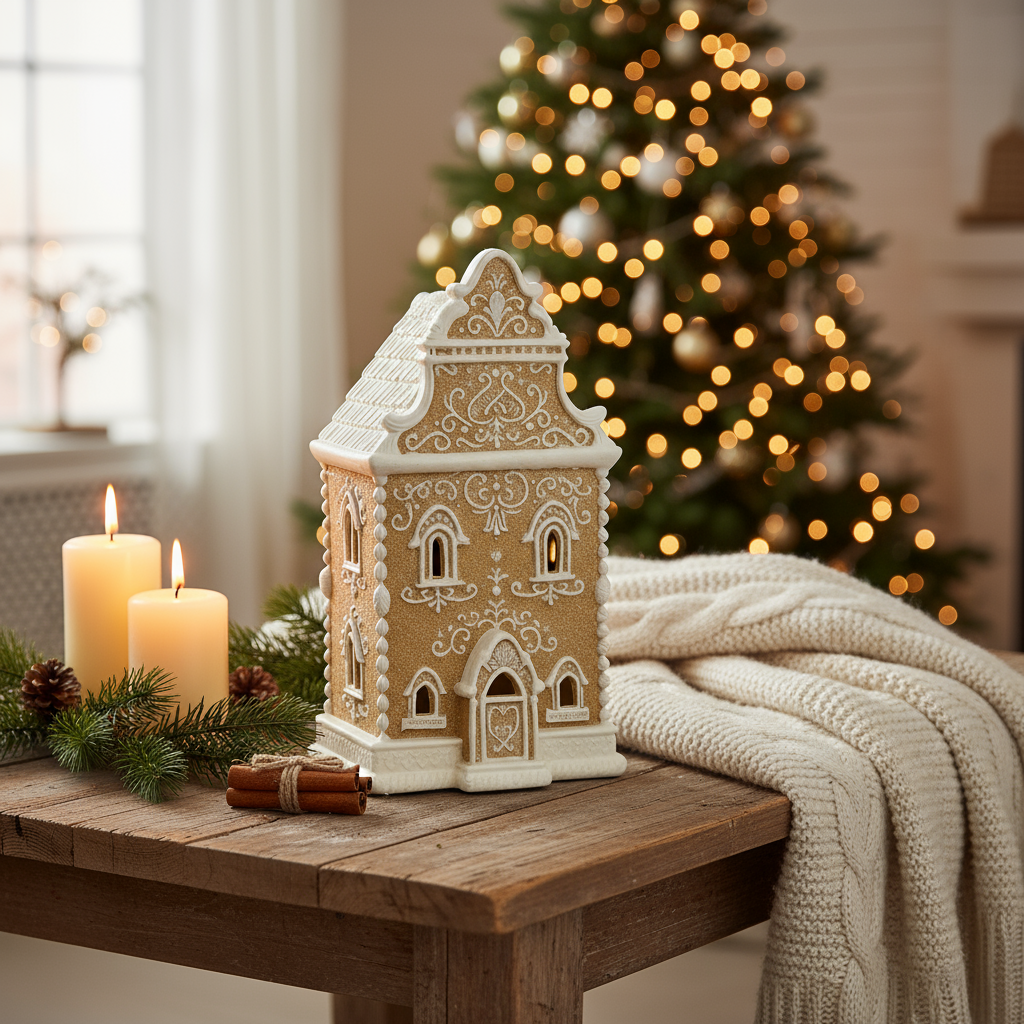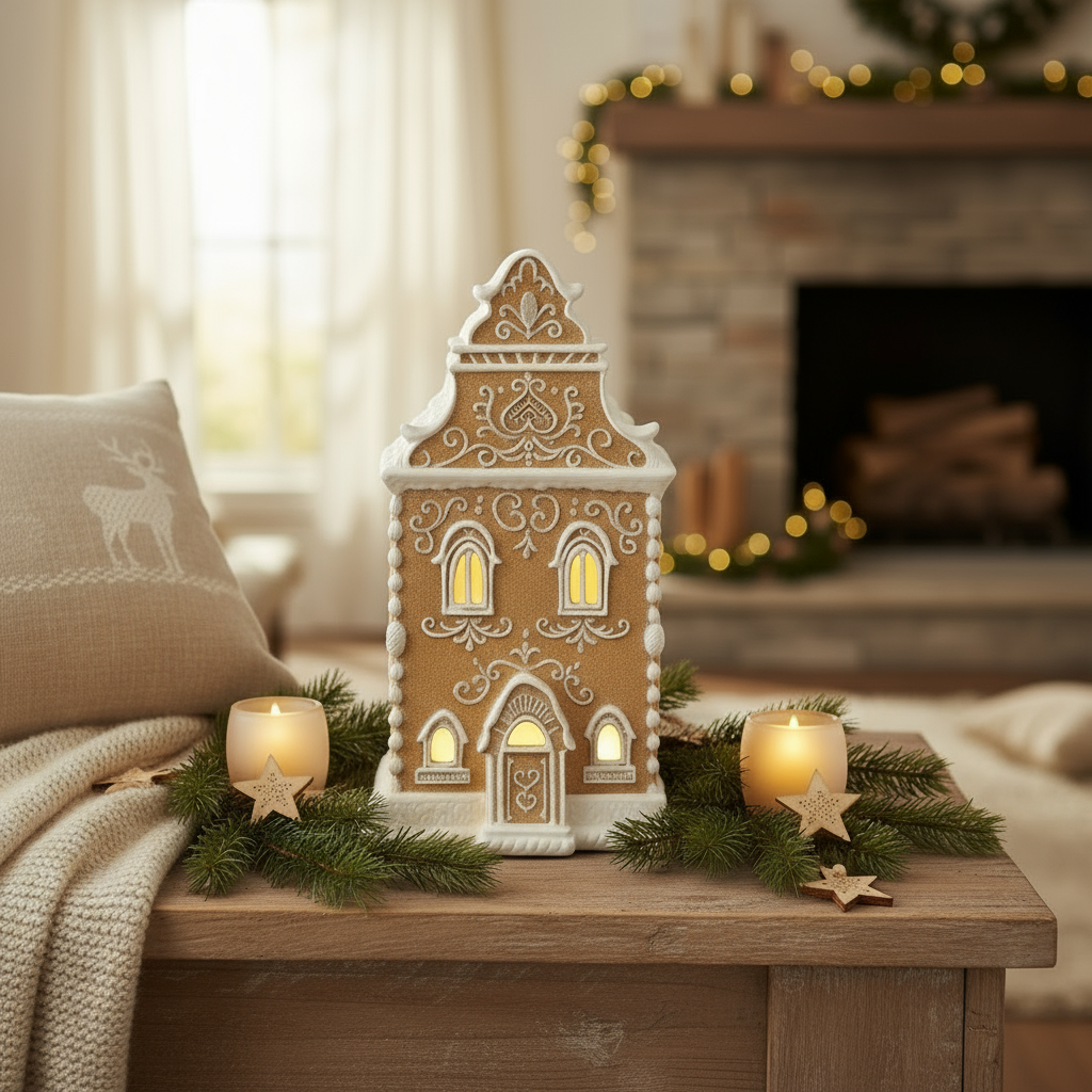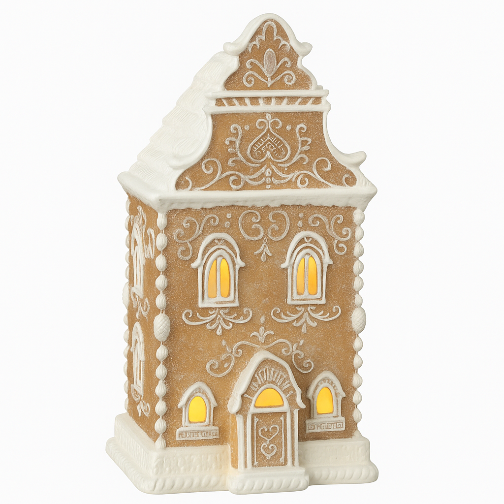 Skap en magisk julestemning hjemme med dette vakre pepperkakehuset med LED-lys. Huset er laget i detaljrik polyresin med dekorative hvite mønstre som minner om ekte glasur. Når lysene tennes, sprer det en varm og koselig glød: perfekt til vinduskarmen, på peishylla eller som midtpunkt i juledekorasjonen.