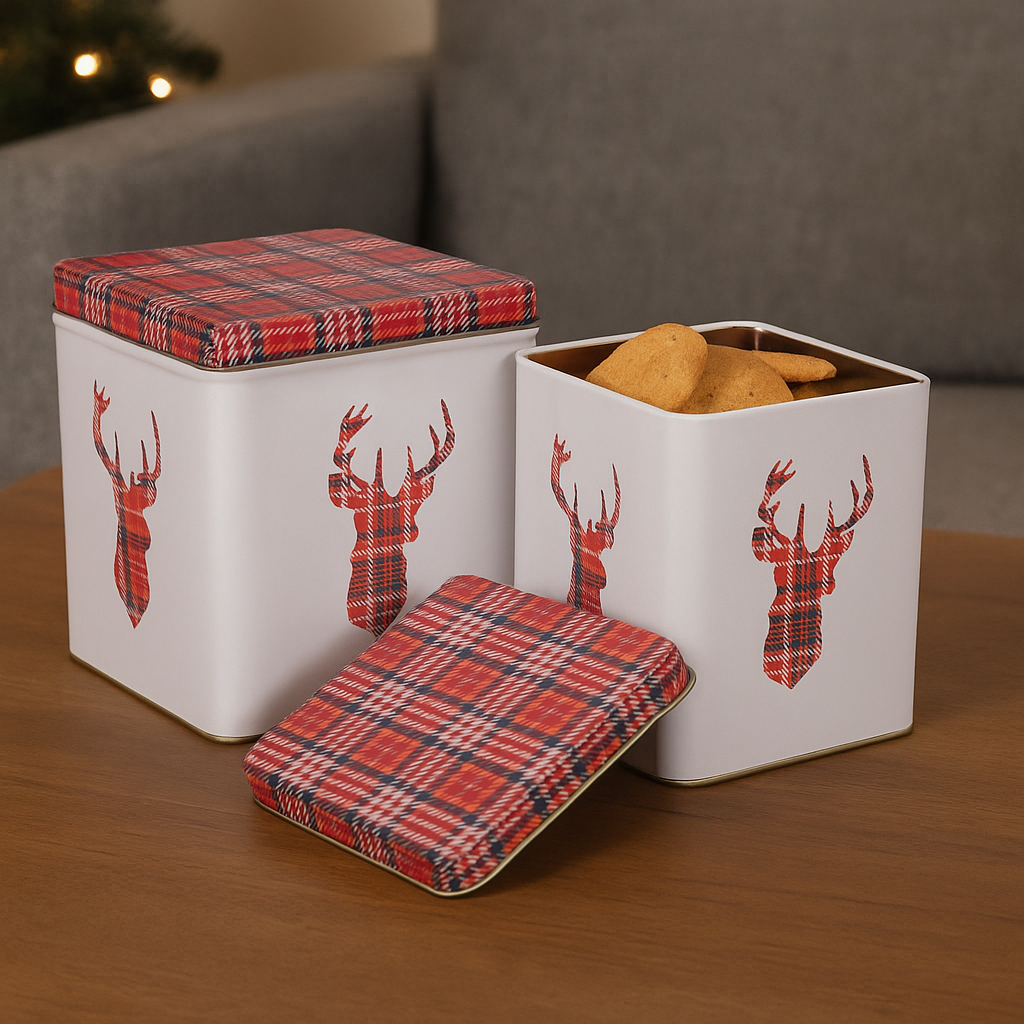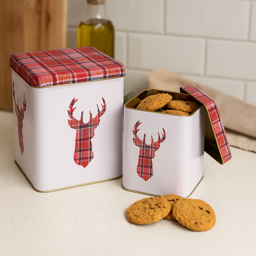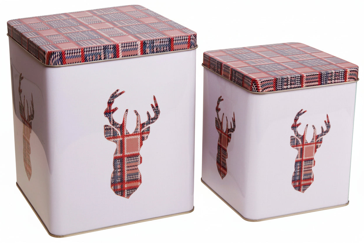 Praktiske og dekorative metallbokser i beige med rutet hjortemotiv i rødt. Settet består av to bokser i ulike størrelser, begge med lokk i matchende rutemønster. Perfekte til oppbevaring av småting, julekaker, kaffe, te eller annet du vil ha lett tilgjengelig.