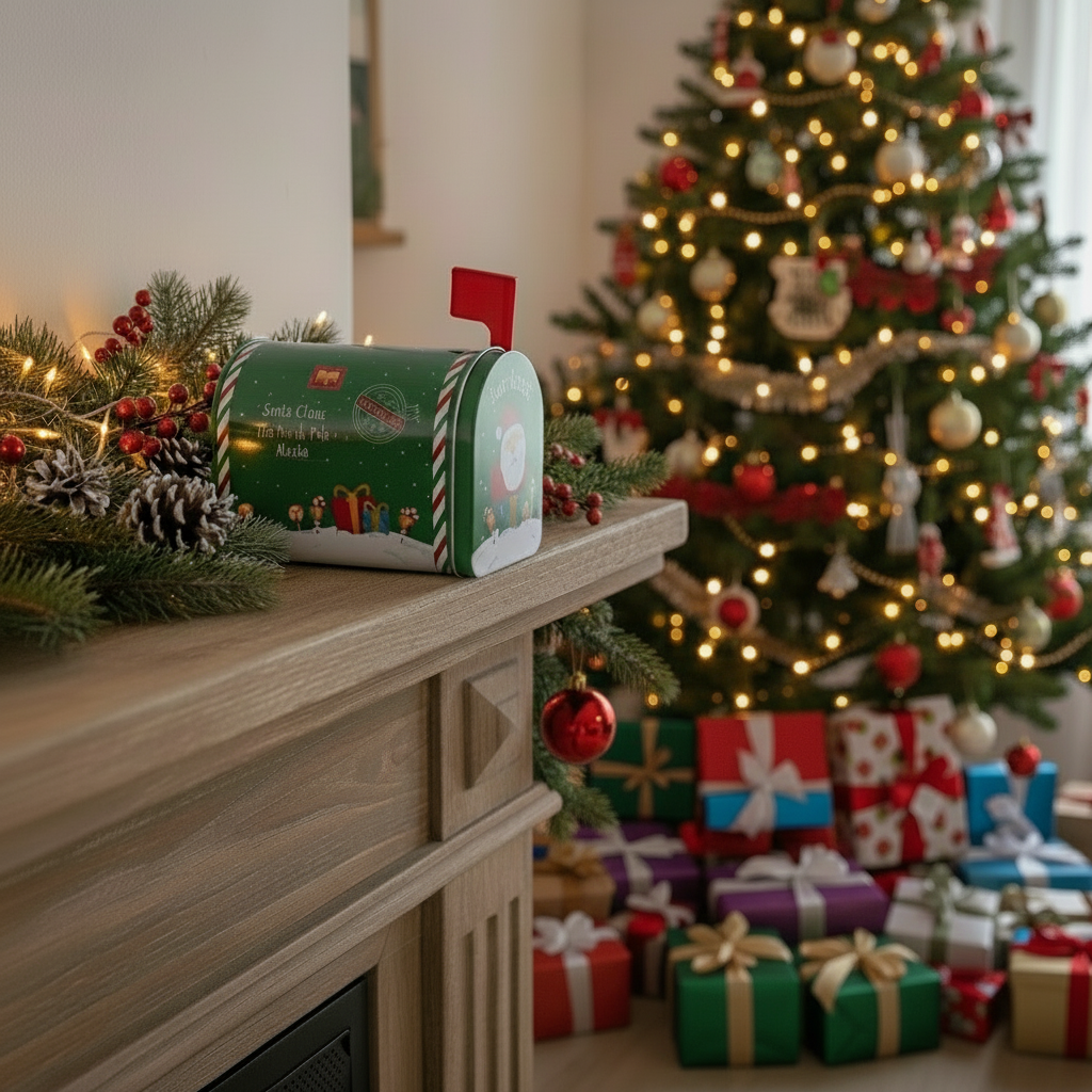 Dekorativ metallboks formet som liten postkasse med julemotiv.