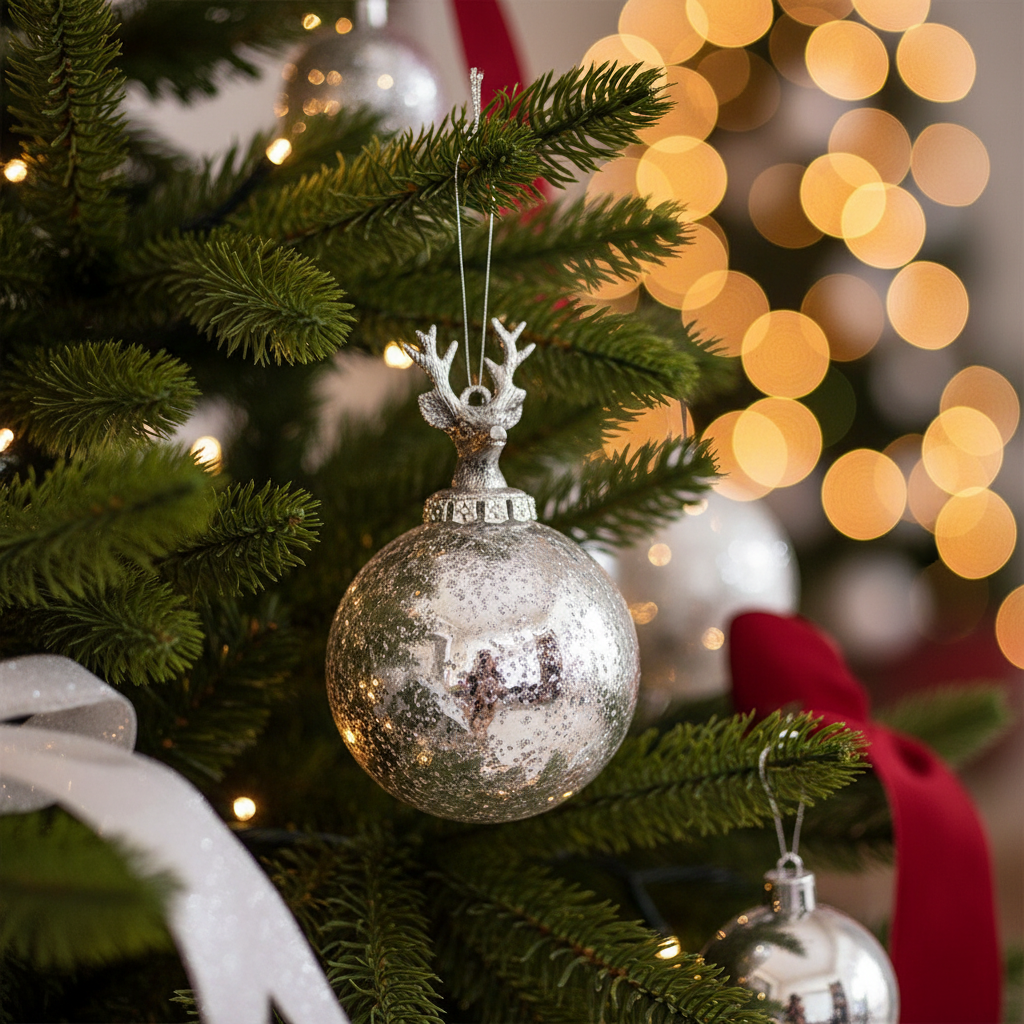 Sølvfarget julekule med hjortehode på pyntefat med granbar, røde lys og juletre i bakgrunnen.