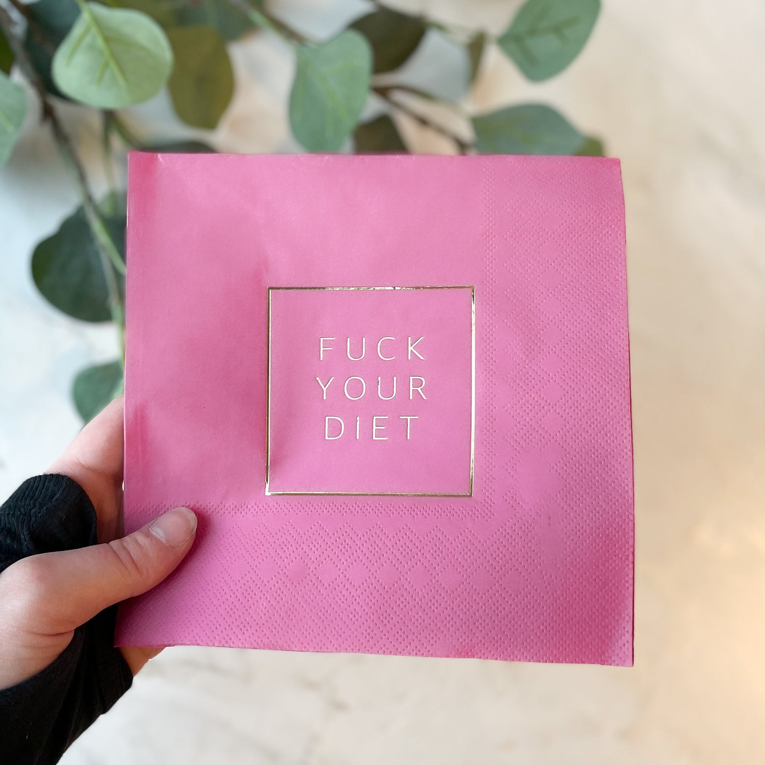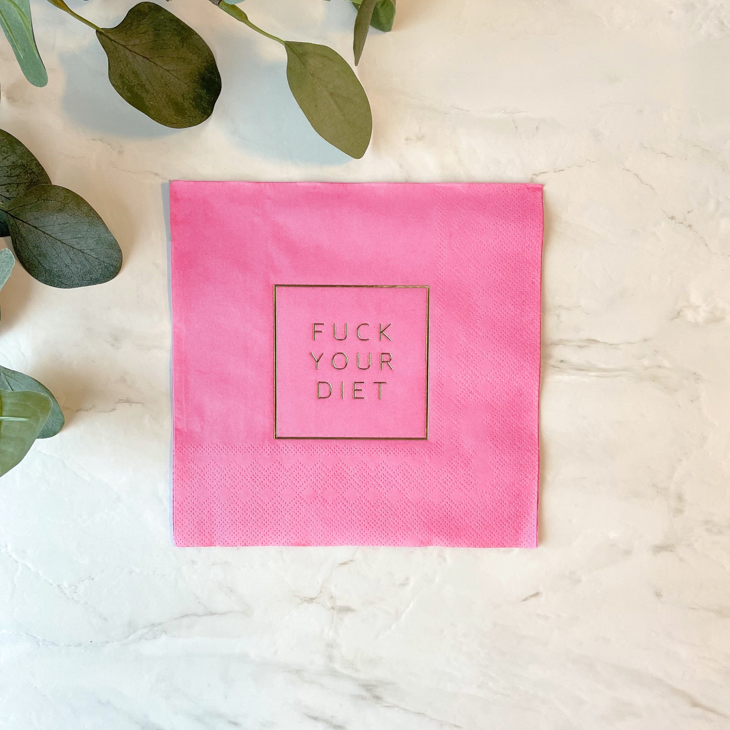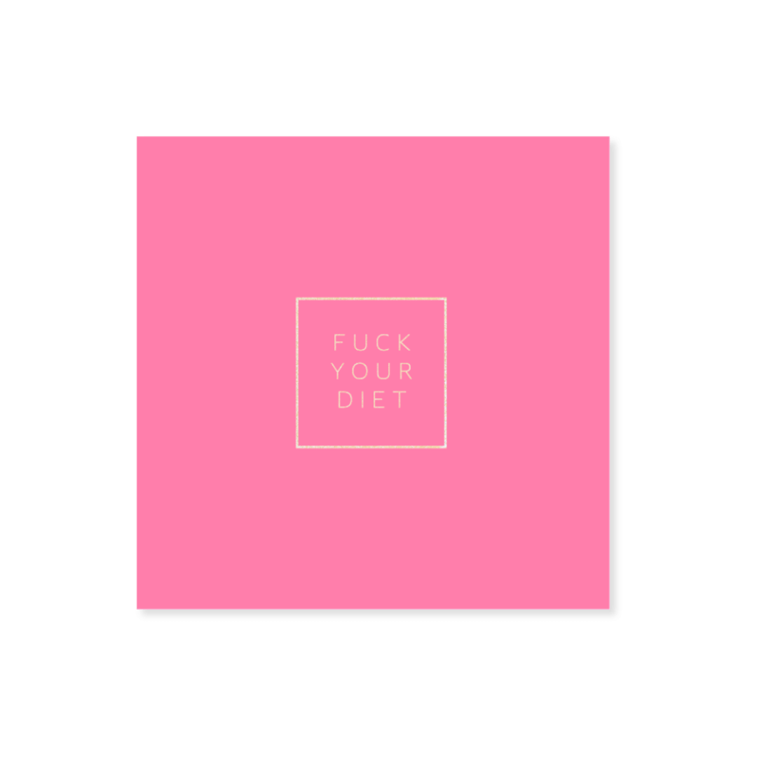 Servietter i rosa med teksten "Fuck your diet" i gull. Serviettene er laget av 3-lagspapir og kommer i en pakke med 20 stk servietter.