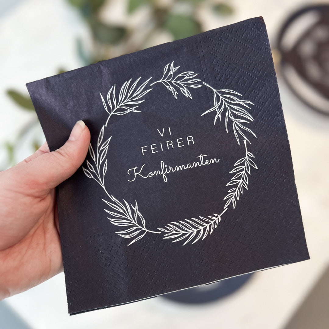 Stilfulle, mørkeblå servietter med teksten "Vi feirer konfirmanten". Serviettene er laget av 3-lagspapir og kommer i en pakke med 20 stk servietter. Perfekt til konfirmasjon til både gutt og jente.