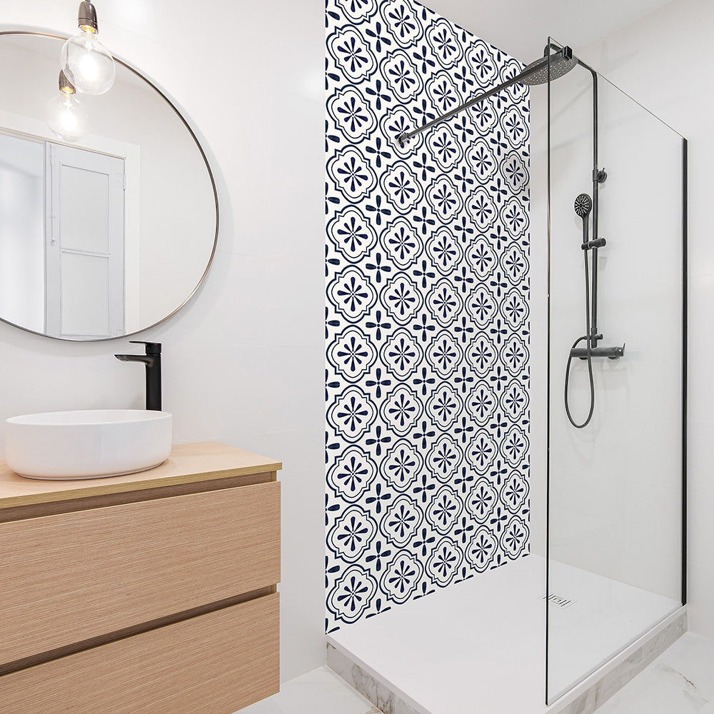 Nova blå selvklebende fliser har et nydelig historisk design som passer perfekt inn i hjemmet. Flisene har et flott historisk mønster i hvit og mørk blå, og ser like fine ut på gulv som på vegg.