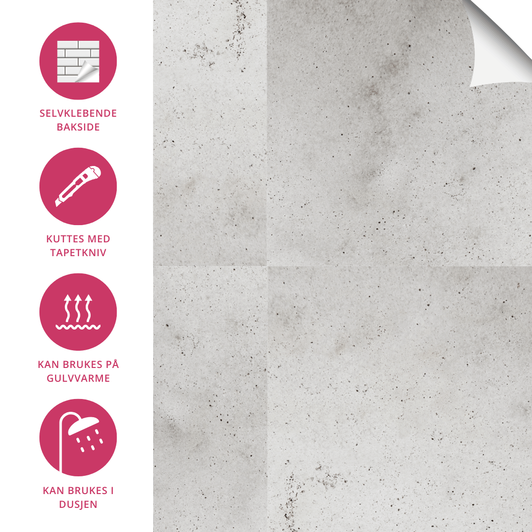 Har du lyst på nytt gulv på badet? Eller kanskje du har lyst på nye fliser i dusjen? Endelig er løsningen her! Disse innovative selvklebende flisene kan festes rett på ditt gamle underlag, til og med på gulv med varme, laminat og i dusjsonen. Ja - du leste riktig! Disse flisene kan brukes på alle slette underlag på både vegg og gulv.
