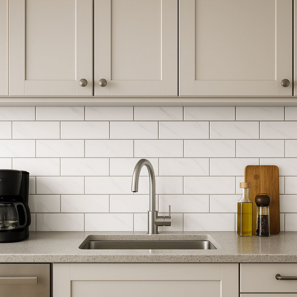Stein Subway marmor selvklebende veggfliser imiterer klassisk hvit marmor med delikate grå marmoreringer og har ferdig grå fuger for et naturlig uttrykk. De selvklebende arkene monteres enkelt uten lim eller fugemasse, perfekt for rask oppgradering av kjøkken, bad eller vaskerom.
