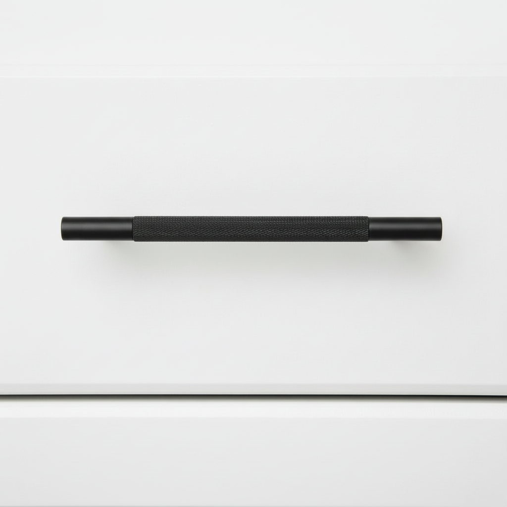 Stockholm håndtak i sort messing. Dette nydelige håndtaket har et moderne og stilfullt design som passer perfekt i nordiske hjem. Perfekt til både kommoden, kjøkkeninnredning, nattbord - gjør møblene dine unike med dette nydelige håndtaket. Stockholm håndtakene finnes i både sort, gull og grå.