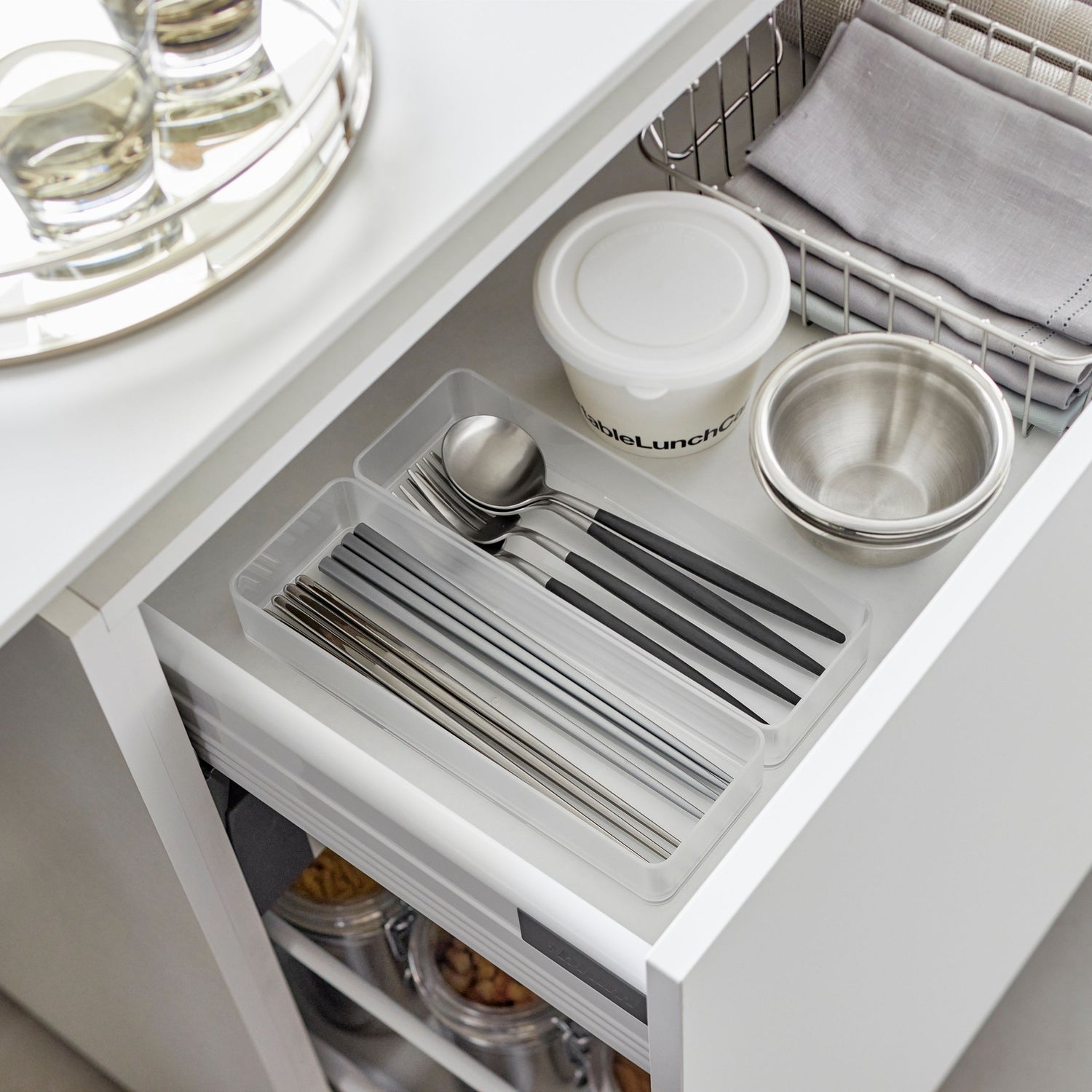 Designet i solid og slitesterk plast, er de ideelle for oppbevaring av bestikk, småredskaper eller kosmetikk. Stablingsmuligheten gjør dem plassbesparende og fleksible i bruk.