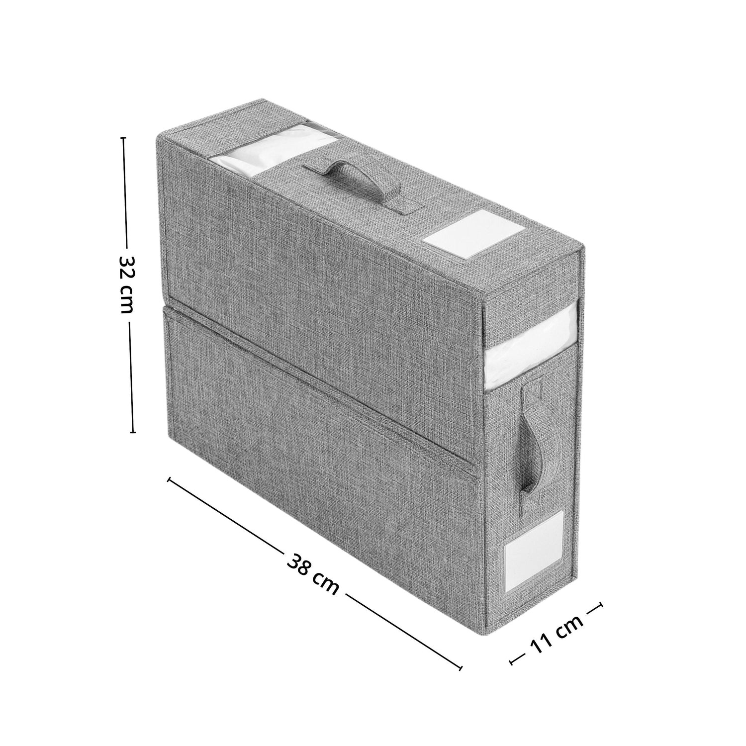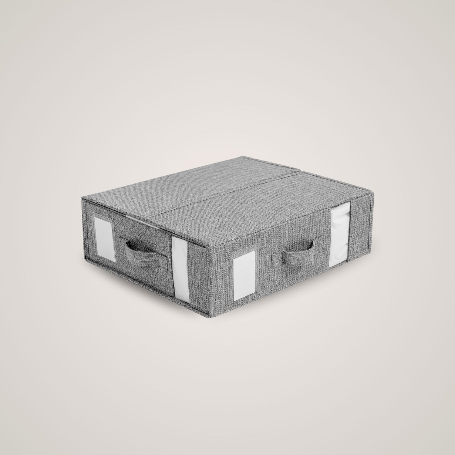 Boksen kan lagres både stående eller liggende etter dine behov. Med vindu for å se design på sengetøy, håndtak og lomme til merkelapper på to sider.