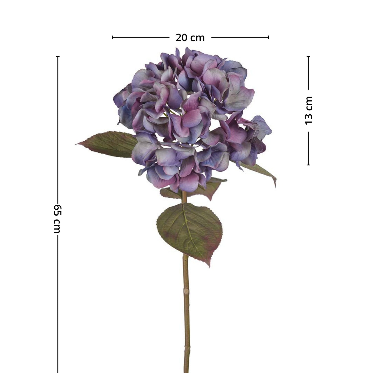 Med høyde på 65 cm og detaljrike blomster i blå og lilla toner er dette et fint valg for deg som ønsker en dekorblomst med mye fylde og synlig fargespill. De naturtro kronbladene og bladene gjør blomsten velegnet både alene i vase og som del av en større bukett.