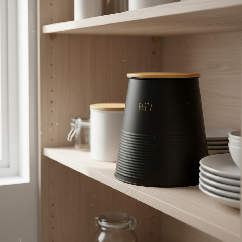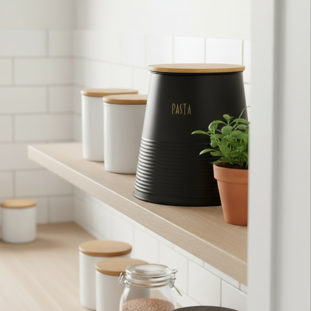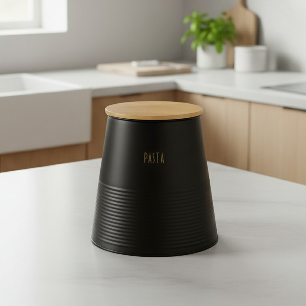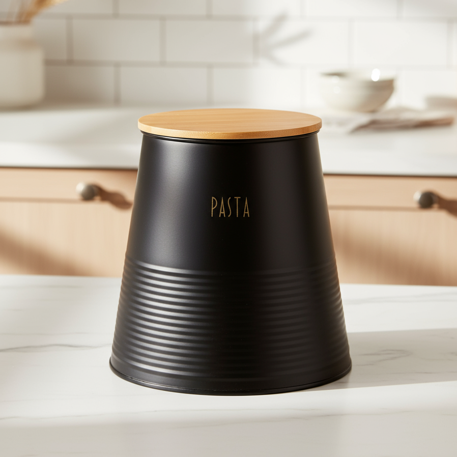 Gi kjøkkenet bedre orden med en lufttett pastaboks som både beskytter matvarene og gir en ryddigere kjøkkenbenk. Beholderen er laget i slitesterkt metall og har et bambuslokk med tett silikonring som holder pastaen tørr og frisk lenger. Den er perfekt for spaghetti, penne, fusilli og andre typer pasta du vil ha lett tilgjengelig.