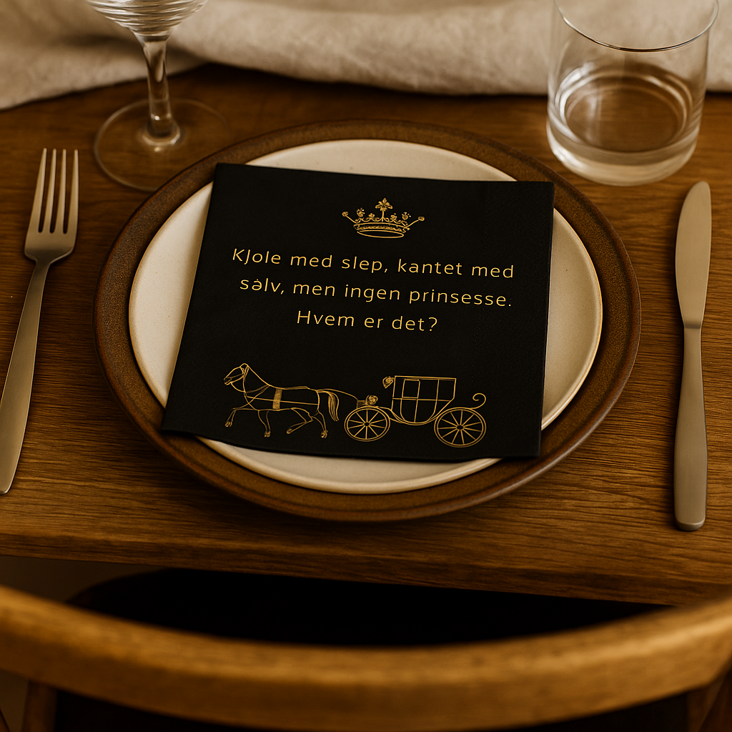 Svart serviett med gullmotiv og tekst ligger realistisk på tallerken i naturlig lys.