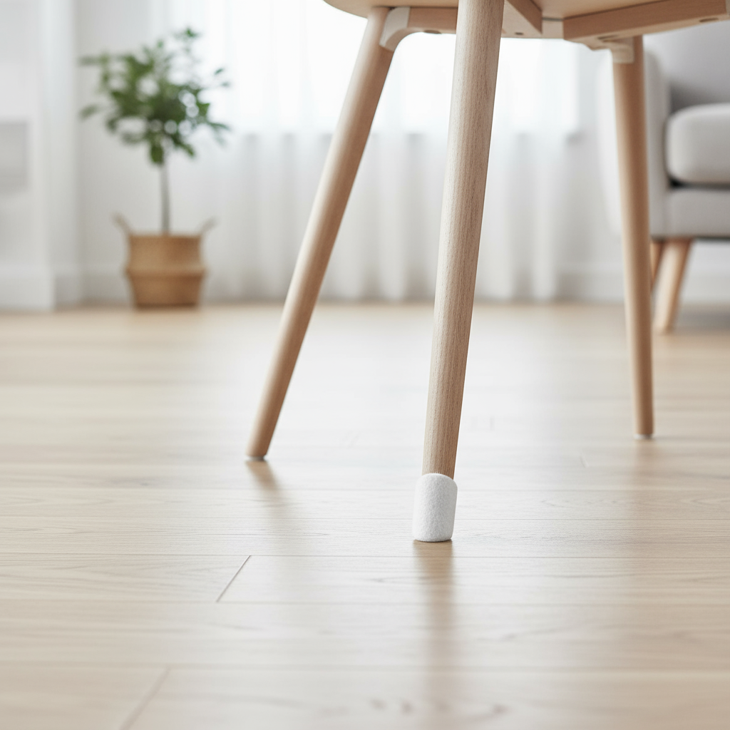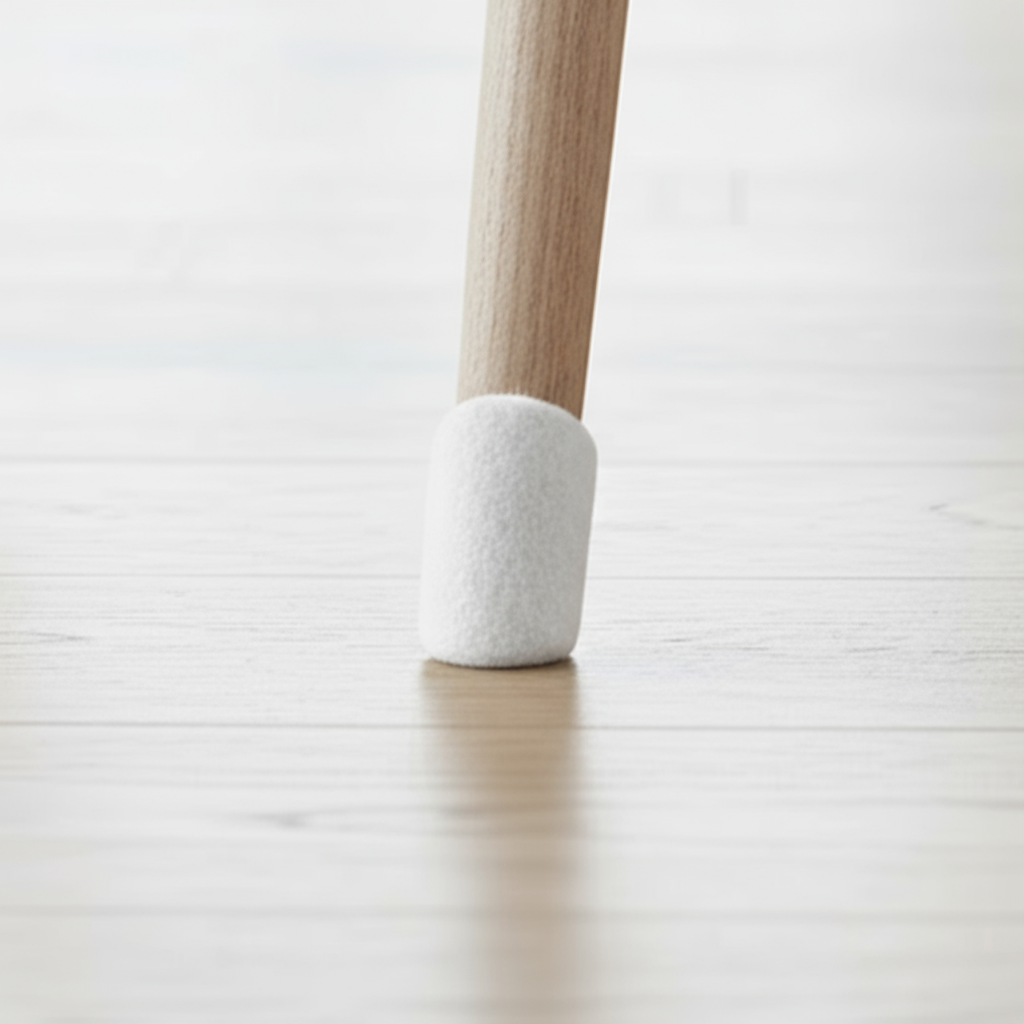 Hvit filtknott festet under stolbein på lyst gulv fra Lindas Dekor