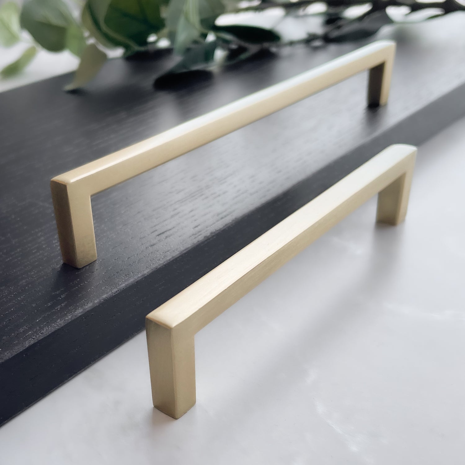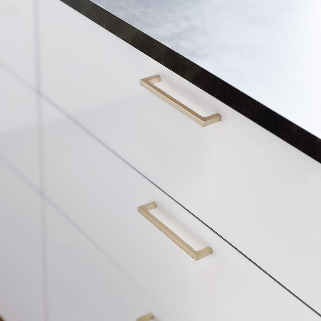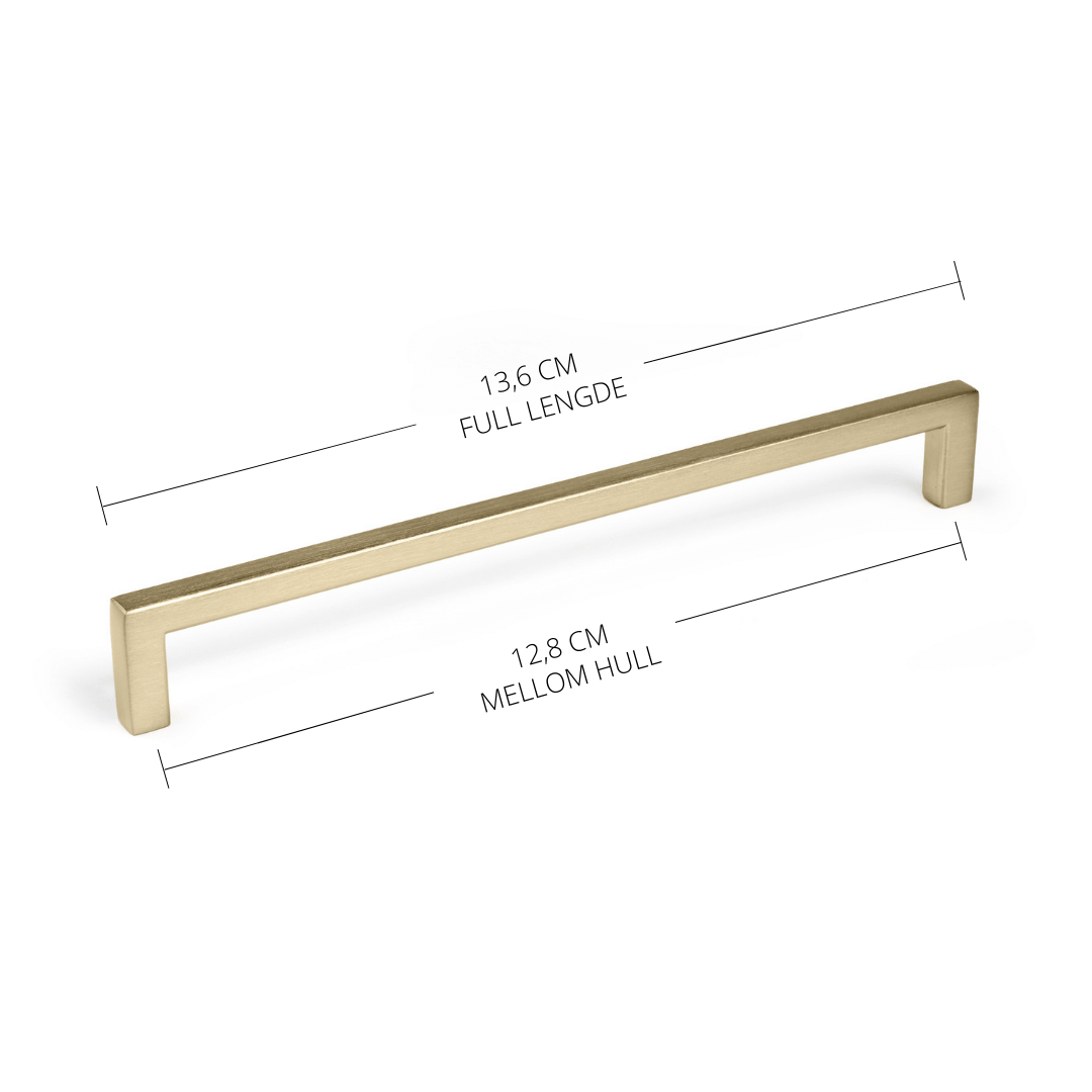 Håndtak børstet messing er håndtaket er stilrent og gir et minimalistisk utrykk med rette kanter, mens innsiden er noe avrundet for å gi et komfortabelt grep. Håndtaket er perfekt til å fornye kjøkkenskap, kommoder, nattbord, baderomsinnredning og mer.