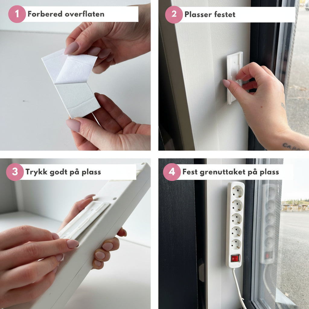 Den sterke selvklebende baksiden festes enkelt til flater som vegger, skrivebord, benkeplater og skap. Med en enkel feste- og frigjøringsmekanisme kan du montere og fjerne grenuttaket uten bruk av verktøy.