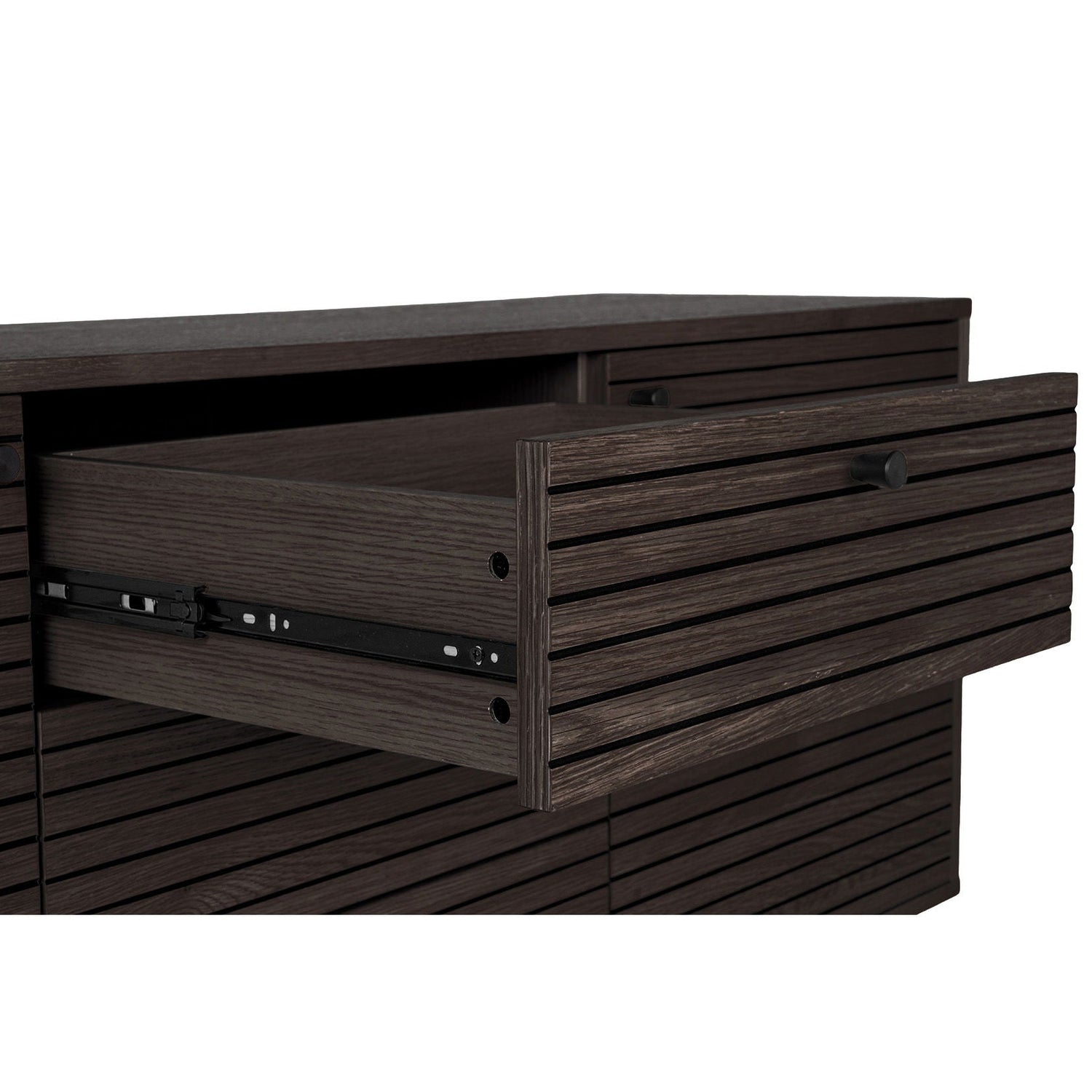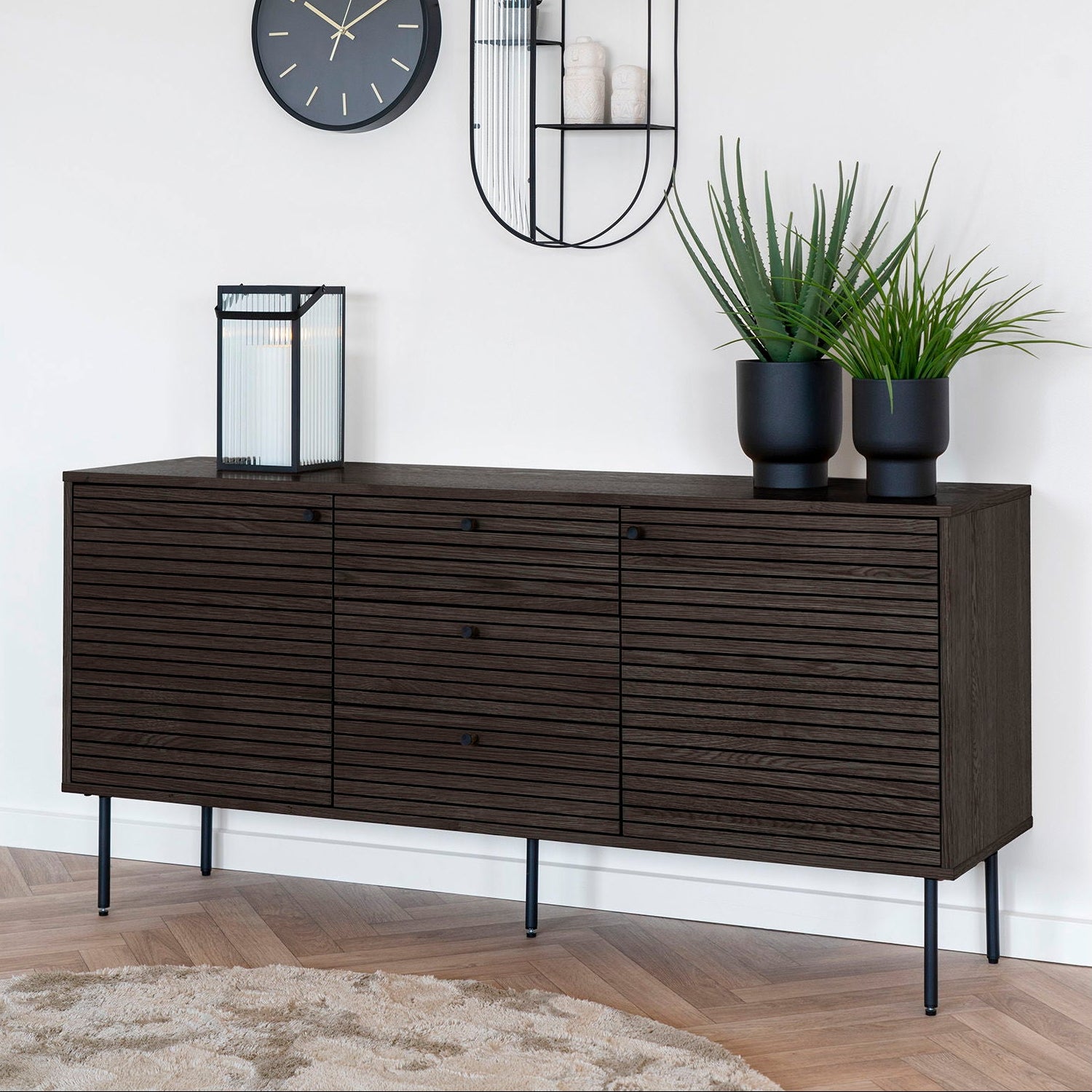 Sideboard i røkt eikefinér med svart metallunderstell. Møbelet har tre skuffer og to skapdører som gir god plass til oppbevaring. Den mørke fargen og rene linjene gjør at den passer godt i både moderne og klassiske hjem.