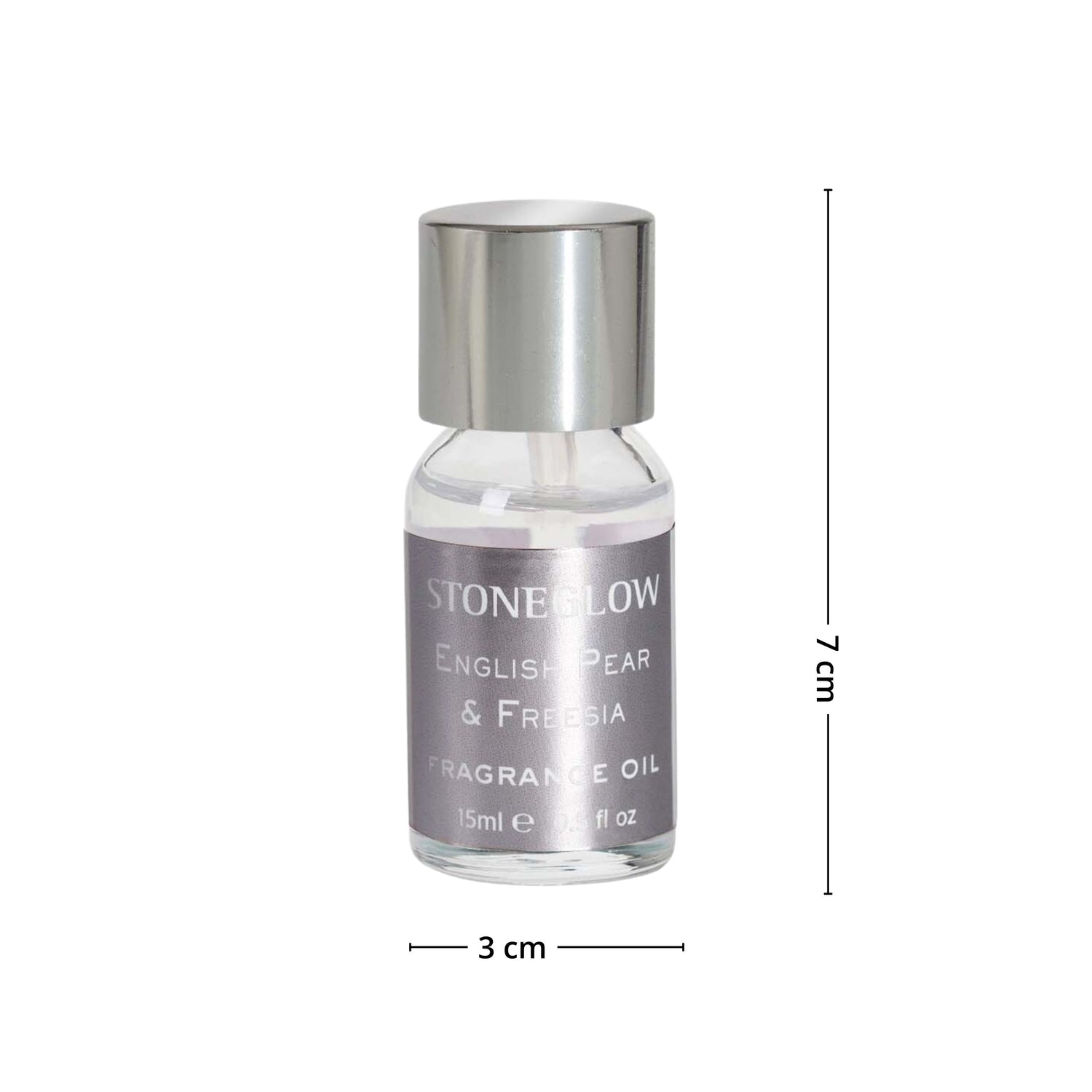 Flaske med Stoneglow English Pear & Freesia duftolje foran en fersk, grønn pære.