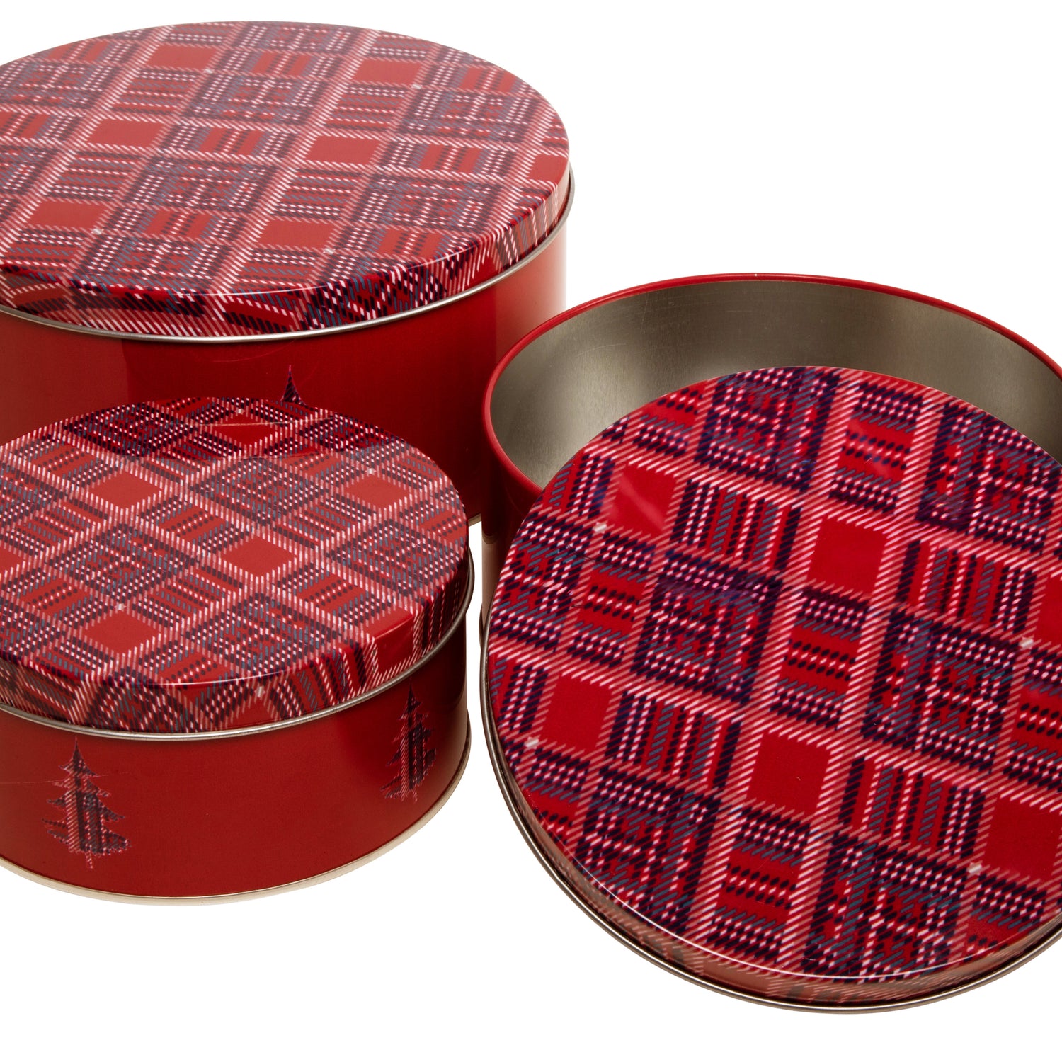 Oppbevaringsbokser i rødt metall med rutemønster, sett á 3 størrelser – ideelle til småkaker og konfekt.