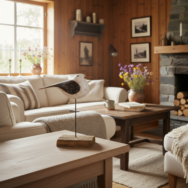 Med sitt rustikke uttrykk, håndmalte detaljer og solide trebase passer denne figuren perfekt inn i både sommerhytter, strandinspirerte hjem og nordiske interiørstiler. Den enkle, stilrene formen gjør den til et vakkert blikkfang på en hylle, kommode eller vinduskarm.