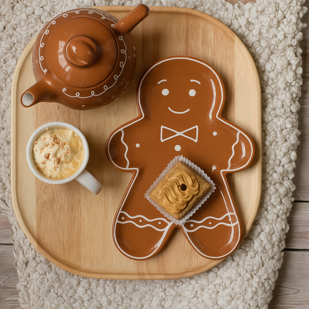Gjør serveringen ekstra koselig med dette serveringsfatet formet som pepperkaker, i karamellbrun og hvit keramikk. Perfekt til småkaker, konfekt, snacks eller som et dekorativt innslag på julebordet.