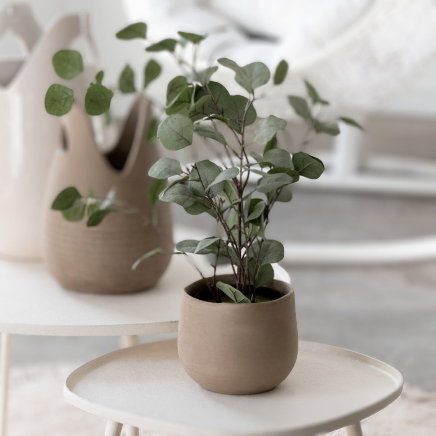 Sett med kunstig eukalyptus og beige potte, plassert på lyst sidebord i moderne interiør. Dekorativ og vedlikeholdsfri plante – perfekt for å skape en naturlig og lun atmosfære i stue, kjøkken eller kontor.