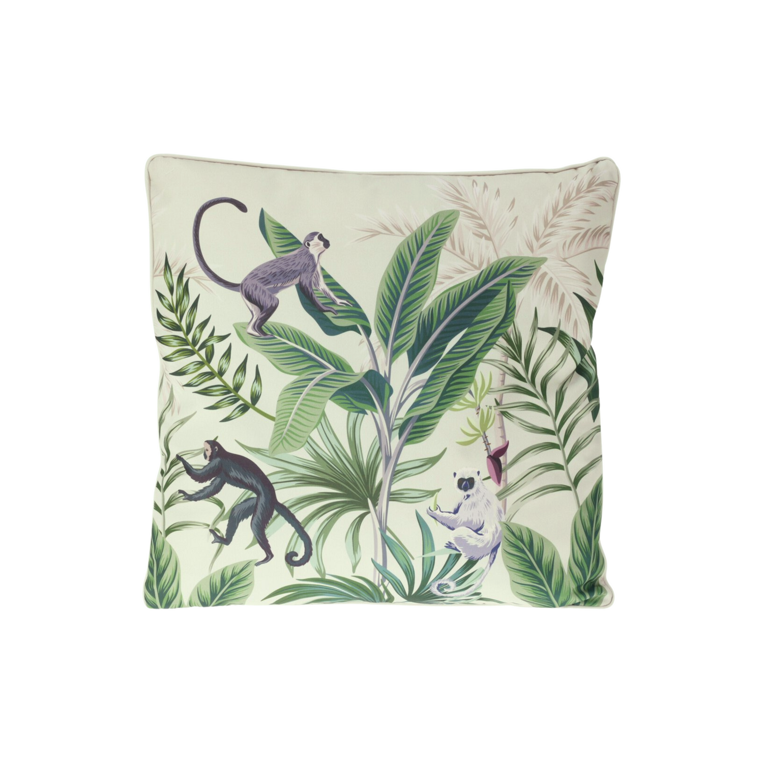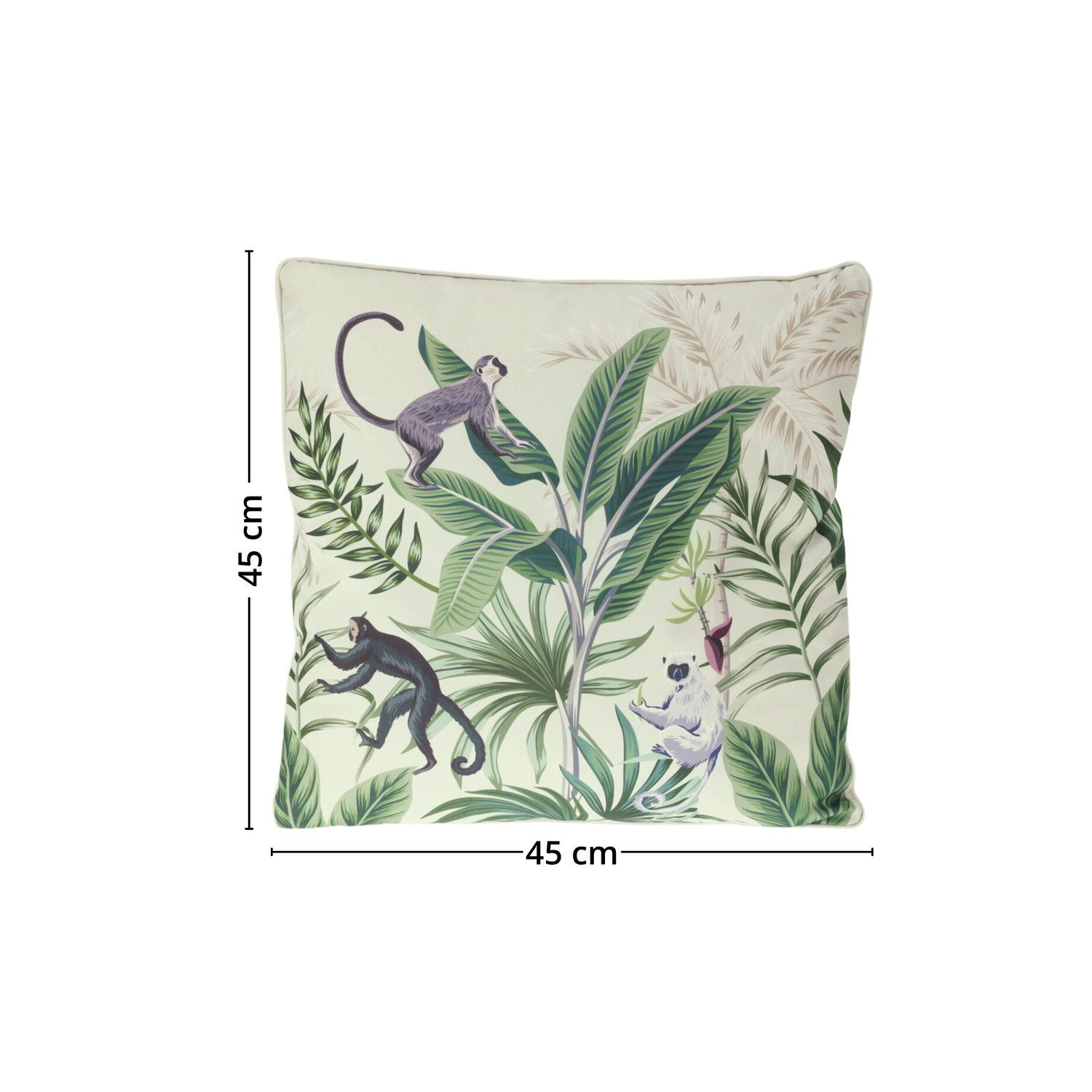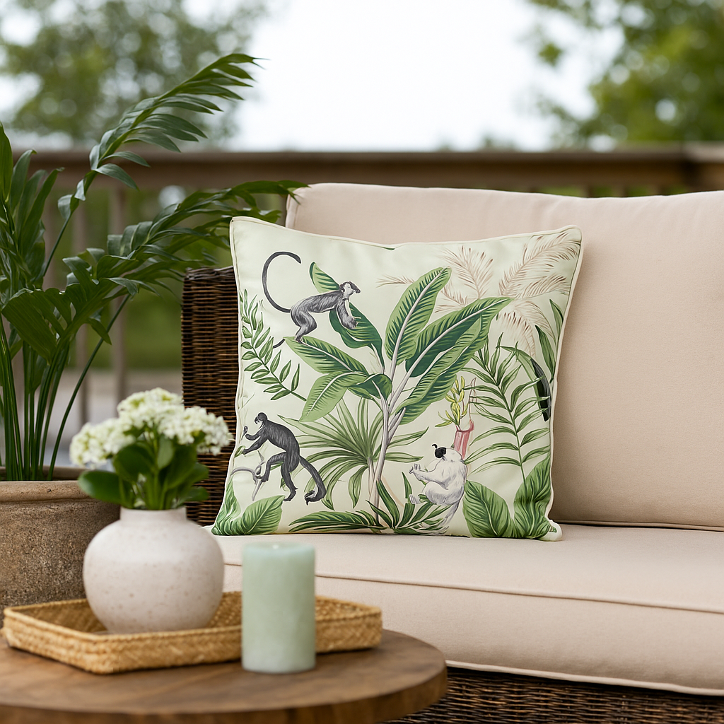 Dekorativ pyntepute med lysegrønn bunn og livlig jungelmotiv med grønne blader og klatrende aper. Puten gir en eksotisk og leken stil til stue, soverom eller uteplass.