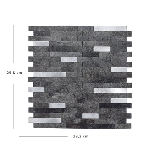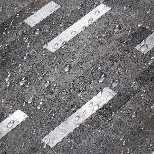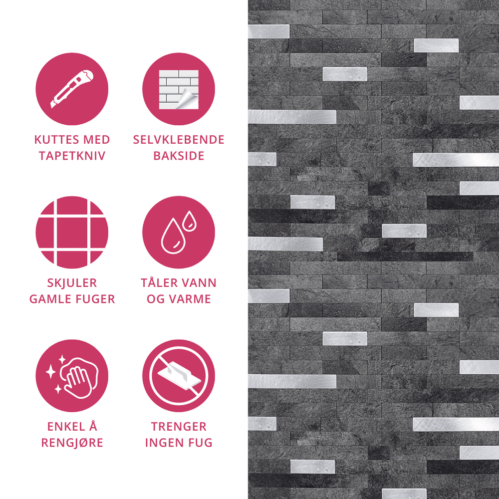 Stein mørk grå selvklebende veggfliser kombinerer rå steinlook med elegant metallisk glans. Flisene imiterer stavmosaikk i mørke gråtoner, med børstet aluminium som gir en sofistikert dybde og struktur.