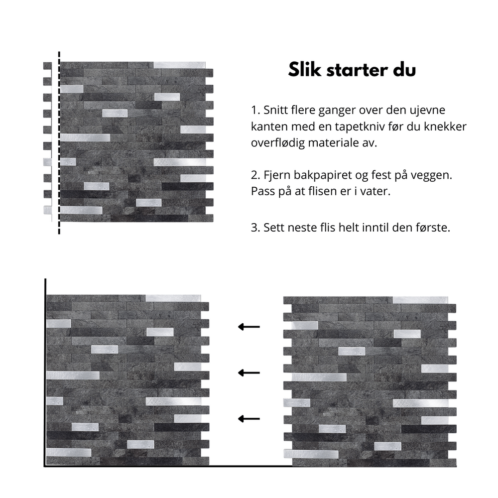Du sparer både tid og penger med selvklebende veggfliser. Flisene monteres direkte på din eksisterende vegg, og er perfekt som sprutvegg og ellers på kjøkken, bad, vaskerom og gang.
