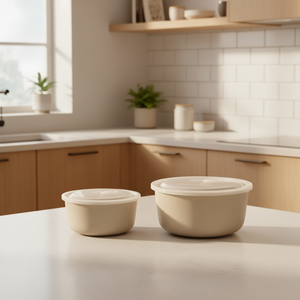 Praktisk skålsett i grått porselen med lokk i to størrelser. Perfekt til rester, snacks og organisering i kjøleskap og på kjøkkenbenken.