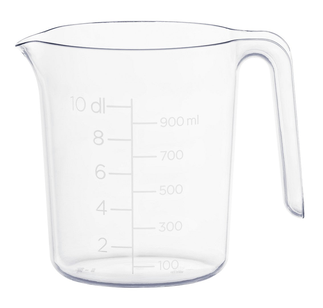 Den transparente plasten gir god oversikt over innholdet, mens den praktiske helletuten sørger for presis og sølefri helling. Håndtaket gir et godt grep slik at du enkelt kan helle væsker eller røremasse uten søl.