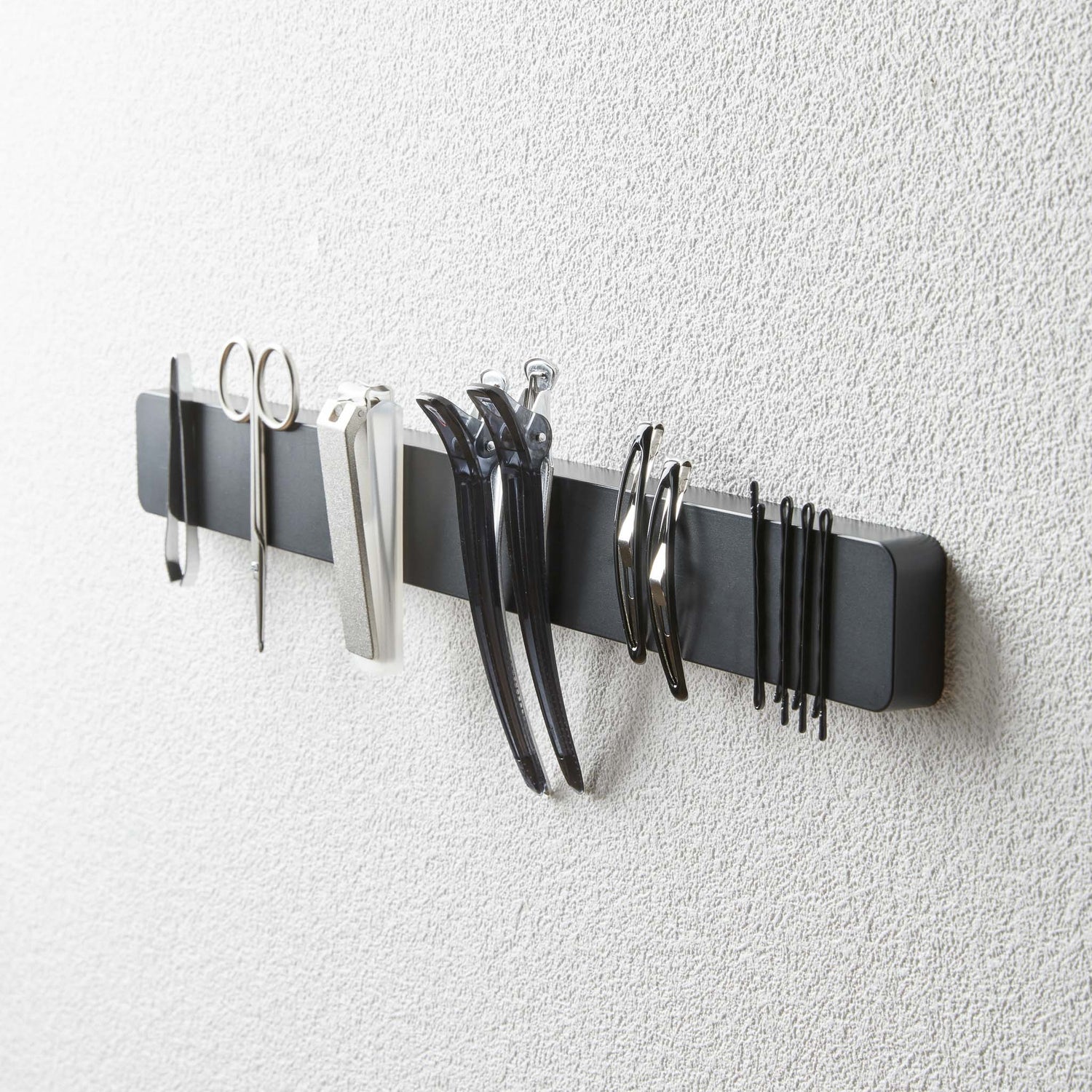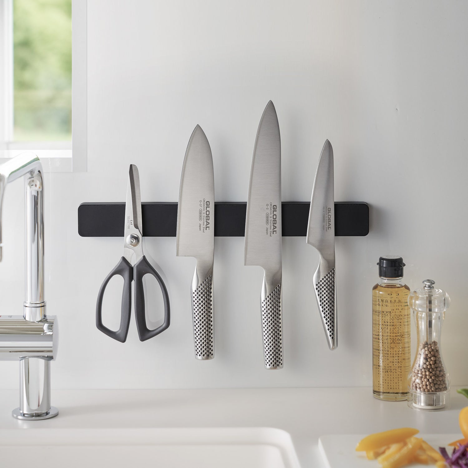 Organiser kjøkkenet med en magnetisk knivholder i sort. Denne veggmonterte knivlisten holder kniver, sakser og kjøkkenredskaper trygt på plass med en kraftig magnet. Du frigjør plass i skuffer og på benken samtidig som du får et rent og profesjonelt uttrykk på kjøkkenet.