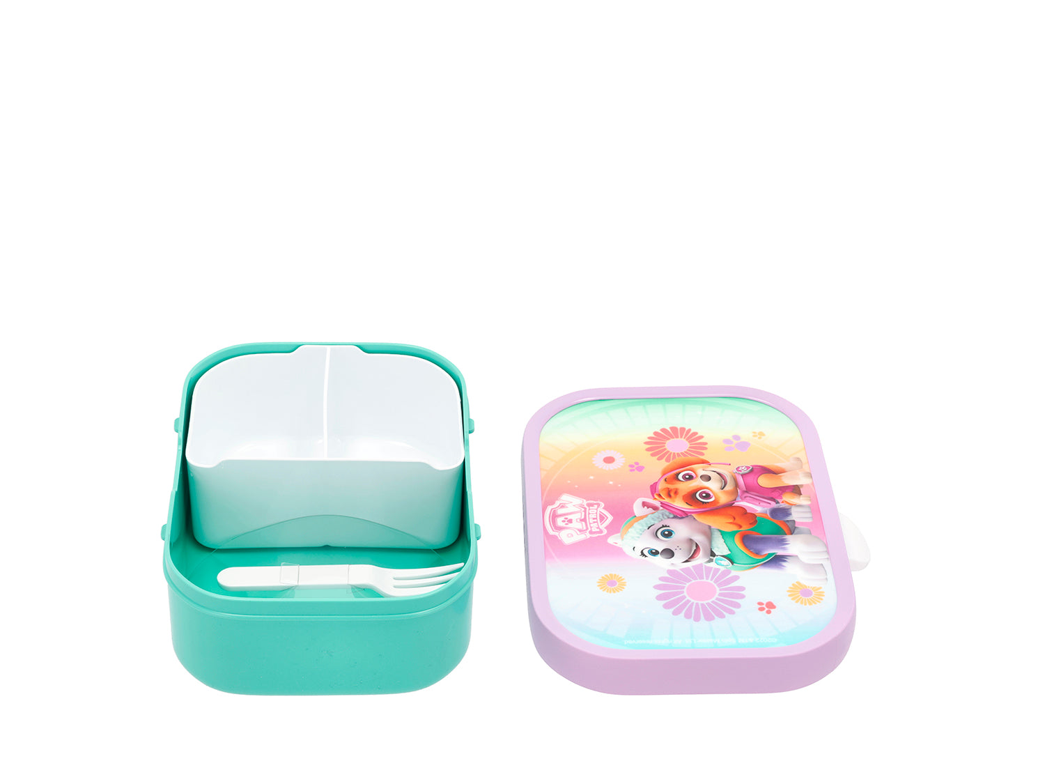 Robust og romslig Mepal matboks med Paw Patrol motiv. Matboksen har en smart og effektiv lukkemekanisme, som er enkel for barna å betjene. Matboksen er 17,5 x 13 x 6 cm, og den inneholder en liten gaffel og en løs innsats med to små rom.