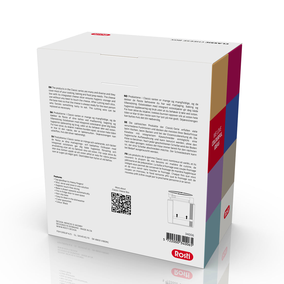 Perfekt til gulost, hvitost og halvfast ost i daglig bruk. Ideell både til frokostbordet og når du vil ha rask tilgang til ost under matlaging.