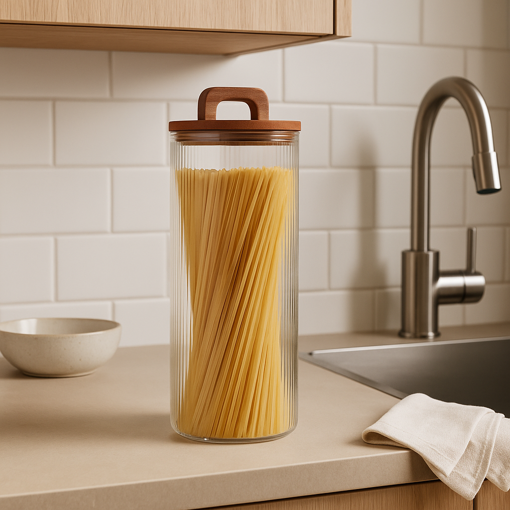 Stor og romslig glasskrukke med lokk i acaciatre. Krukken rommer 1650 ml og er laget i rillet, varmebestandig glass som tåler både varme og kalde matvarer. Den passer perfekt på kjøkkenbenken for oppbevaring av pasta, nøtter, kaffe eller annen tørrvare.